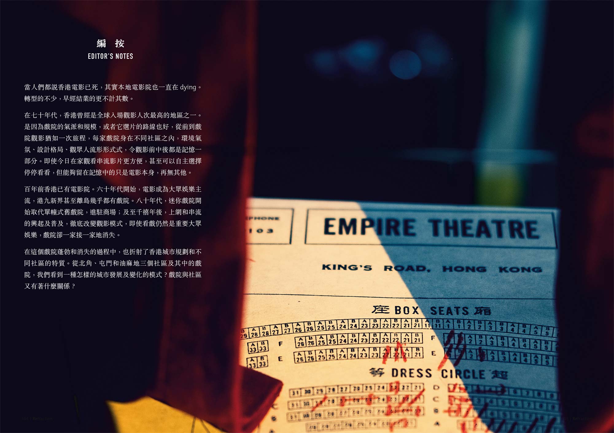 現時香港的戲院共55間,合共提供263個銀幕,約37,000個座位。這個數字相對於六十至九十年代的黃金年代,自是不可同日而語。在昔日,戲院為數眾多,而偏遠如離島新界,區區都有戲⋯⋯