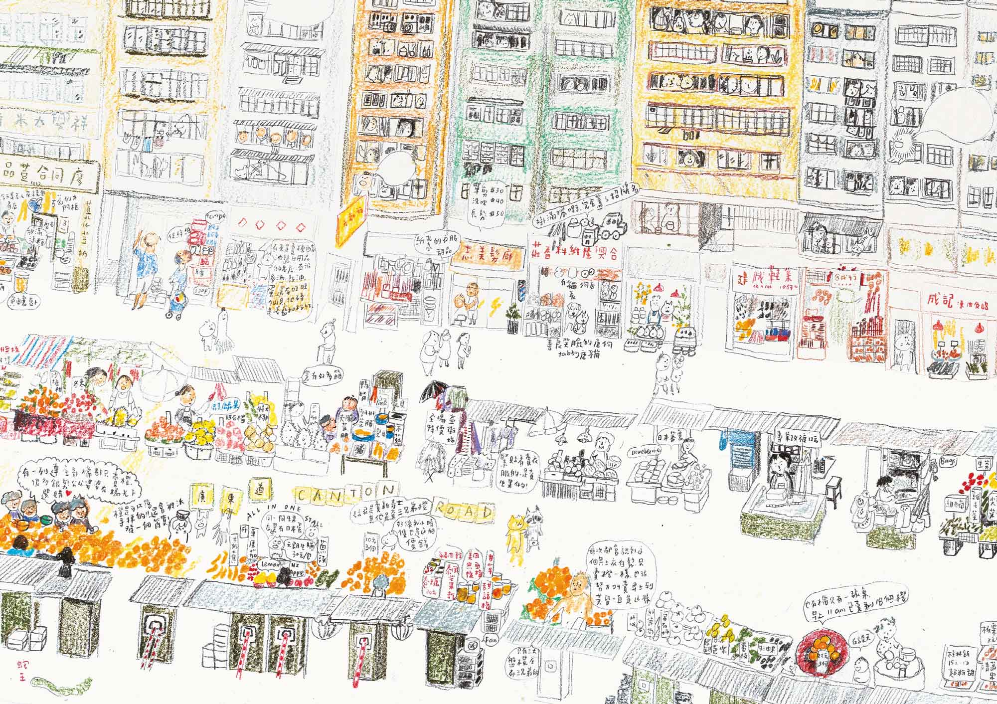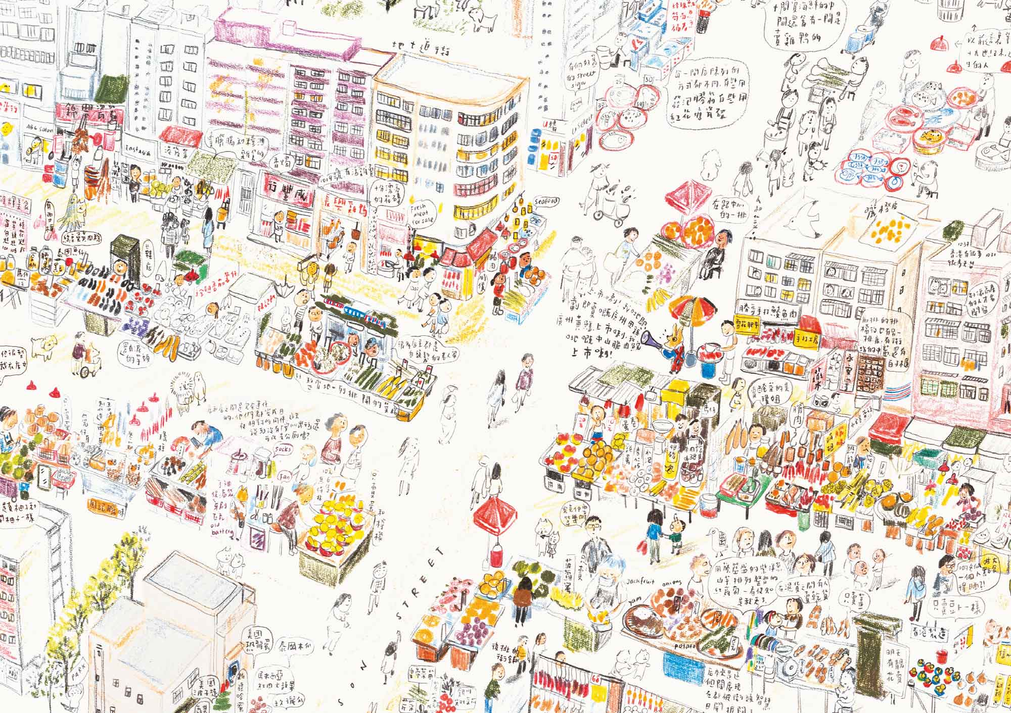 兒時在旺角街頭長大的兒童插家師貓珊,深入廣東道旺角露天街市,仔細地繪畫「街市清明上河圖」,重溫昔日的童年回憶,也希望發掘及記錄街上每一個人每一個檔的特色,展示構成獨一無二的露天市集氣息和體驗。