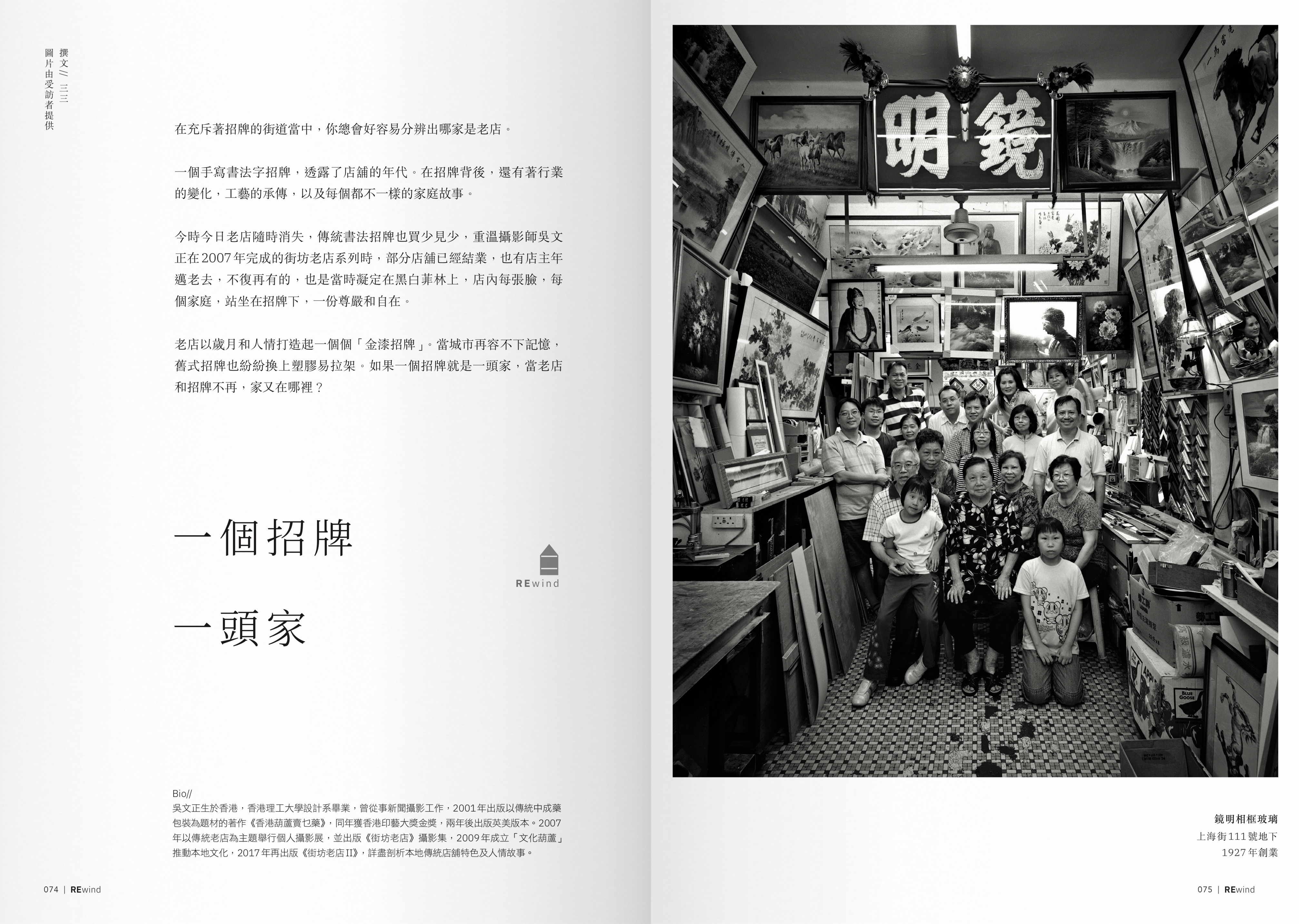 攝影師吳文正早在2007年時便拍攝了「街坊老店」系列,三四百家傳統店舖中雖然部分已經結業,也有店主年邁老去,但在黑白菲林上,卻深刻記住了每個家庭,站坐在招牌下,一份尊嚴和自在。