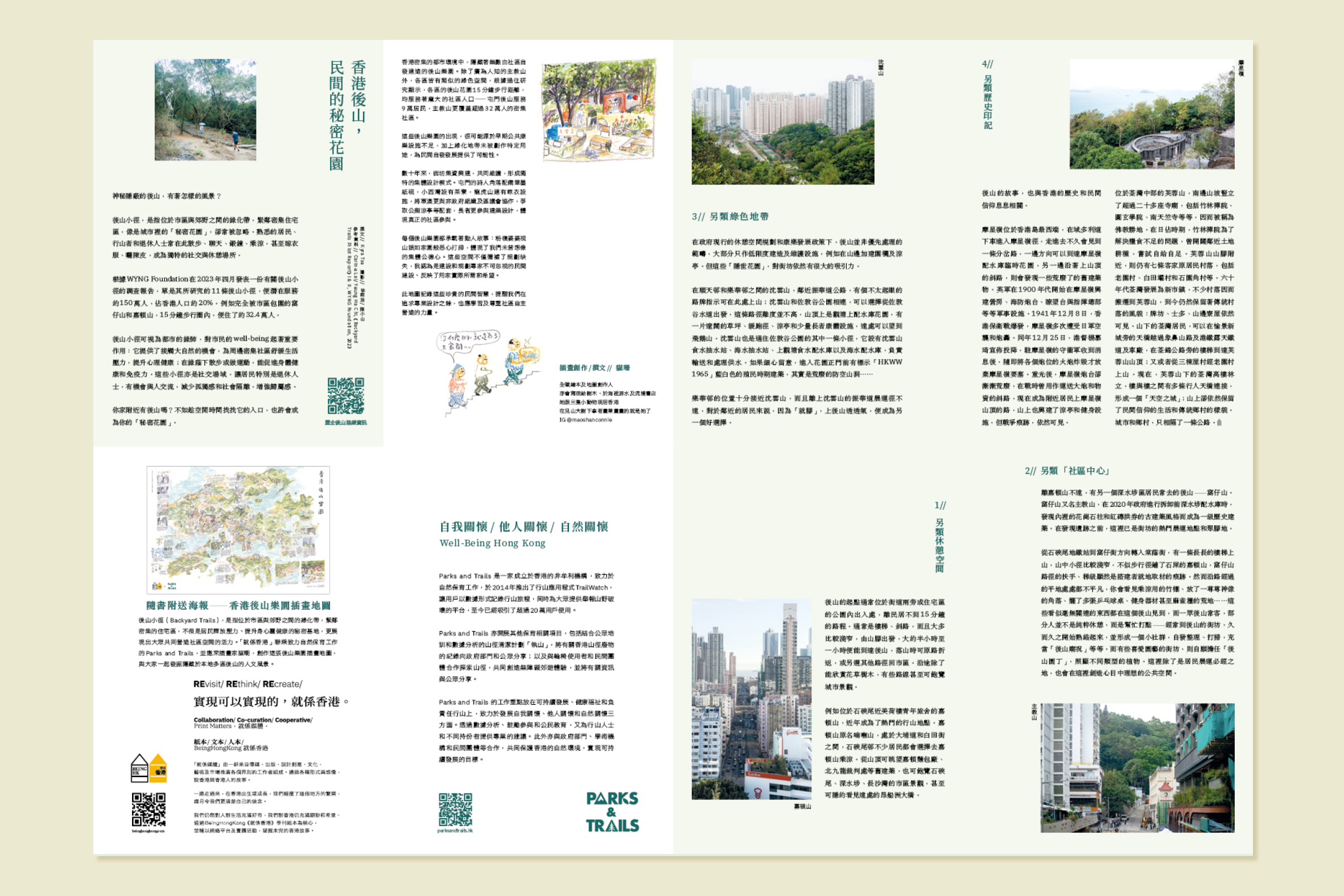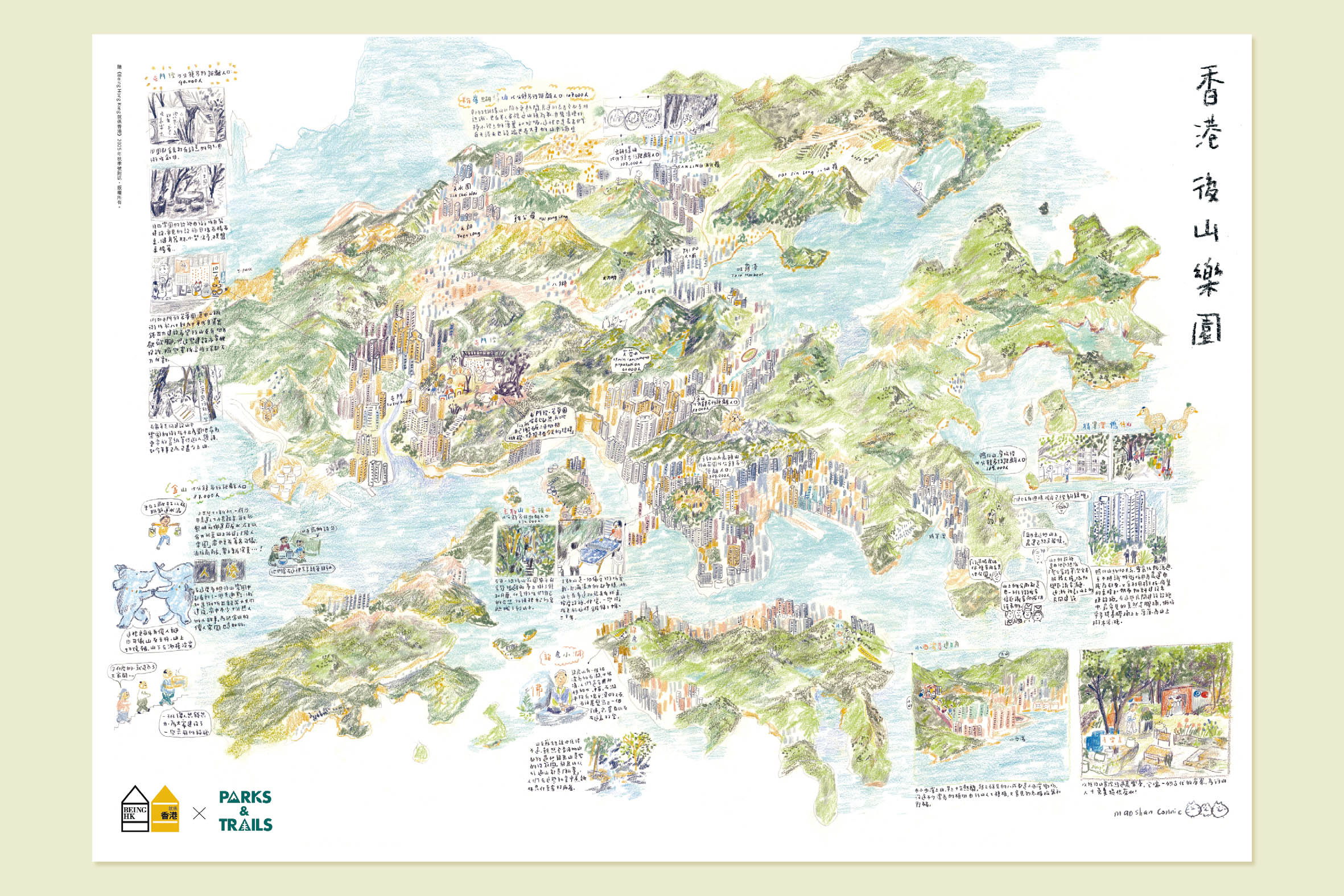 後山小徑(Backyard Trails)是指位於市區與郊野之間的綠化帶,緊鄰密集的住宅區,不但是居民釋放壓力、提升身心靈健康的秘密基地,更展現出大眾共同營造社區空間的活力。「就係香港」聯乘致力自然保育工作的Parks and Trails,並邀來插畫家貓珊,創作一張「香港後山小徑」插畫地圖,一起發掘隱藏於本地多區後山的人文故事。(海報尺吋// 786mm X 560mm)