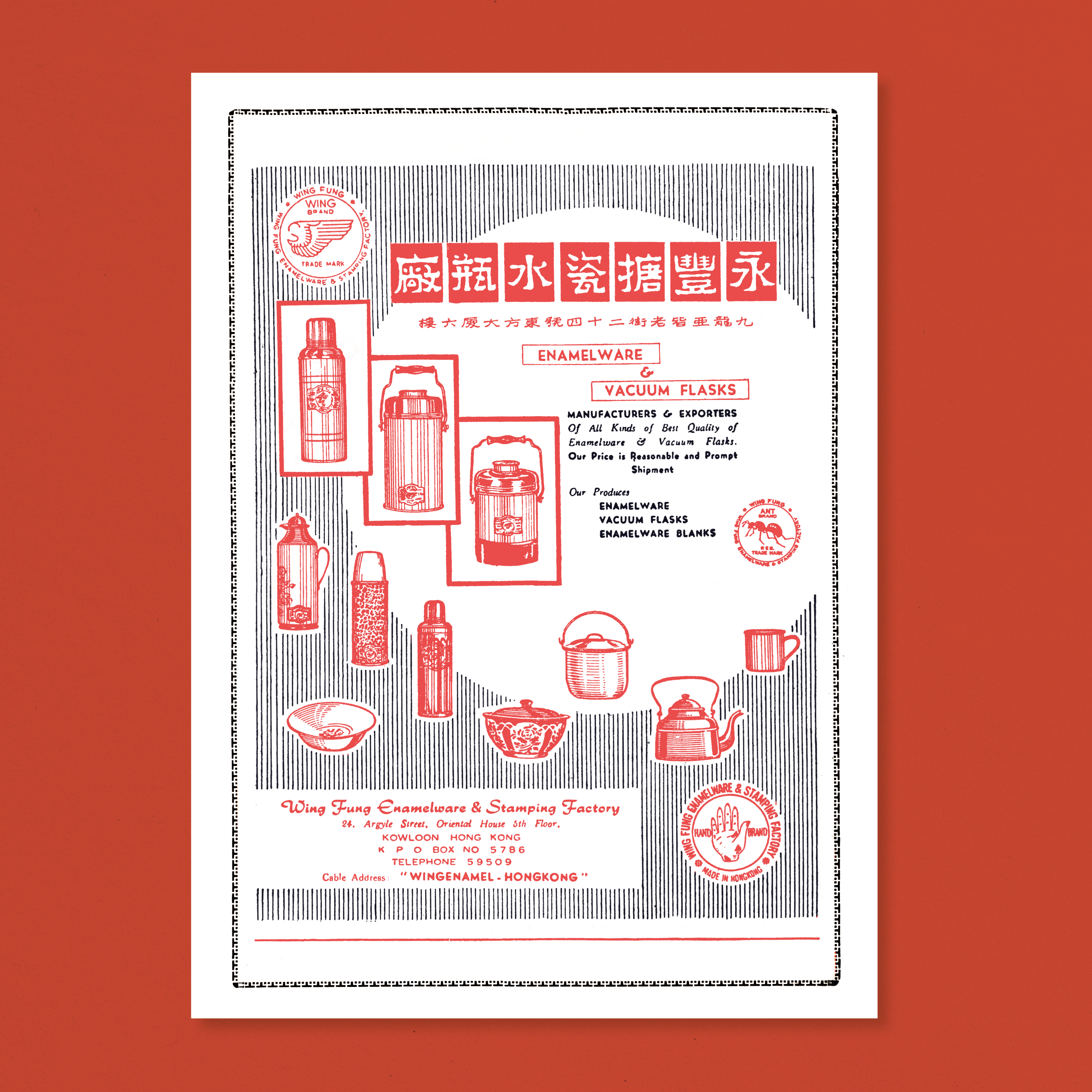六十年代,Made in Hong Kong「香港製造」不但滲透我們的生活當中,也大量行銷海外。這些六十多年前的廣告,絕大部分仍用人手繪畫的插圖和美術字體,突顯產品的創意和特色,反映出當時的美學設計特色外,也說明了不同類型工廠曾經分佈在本港各個社區的歷史。