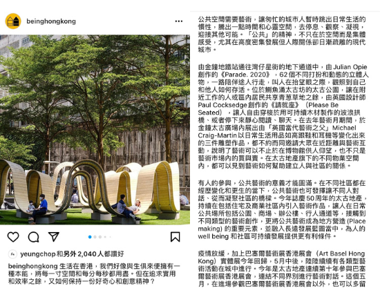 介紹企業於巴塞爾藝術展香港展會期間在社區不同地方引入的藝術作品,除了肯定背後的創作理念,也勾勒出這些作品作為公共藝術如何和周遭的人和環境互動,為城市裡的人創造更多對話的可能性,重拾生活的質感和美感。
