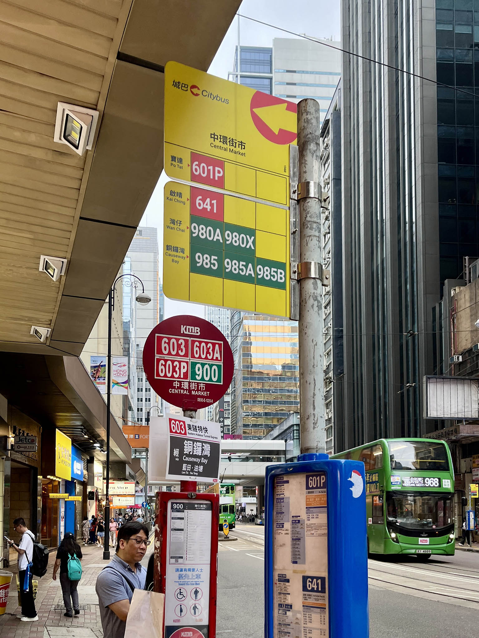 有趣的是,在某些巴士站卻會看見一些巨型站牌——例如灣仔入境事務大樓站,乘客在五米外已經清晰可見城巴和九巴的路線號碼及路線方向;如果向前走到其他路線的侯車處,眼前卻會出現三種不同的路牌——普通的長方型「旗仔」、成年人般高度的大型站牌、電子顯示屏,全部都是展示一樣的路線內容,而電子顯示屏有一半的畫面是播放著城巴的影片和廣告。另外,在同樣繁忙的中西區,例如上環林士街站,因為環境空間所限,只有普通的「旗仔」,每當下班時間還有滿滿的侯車人潮,幾乎佔了一半行人路的範圍。