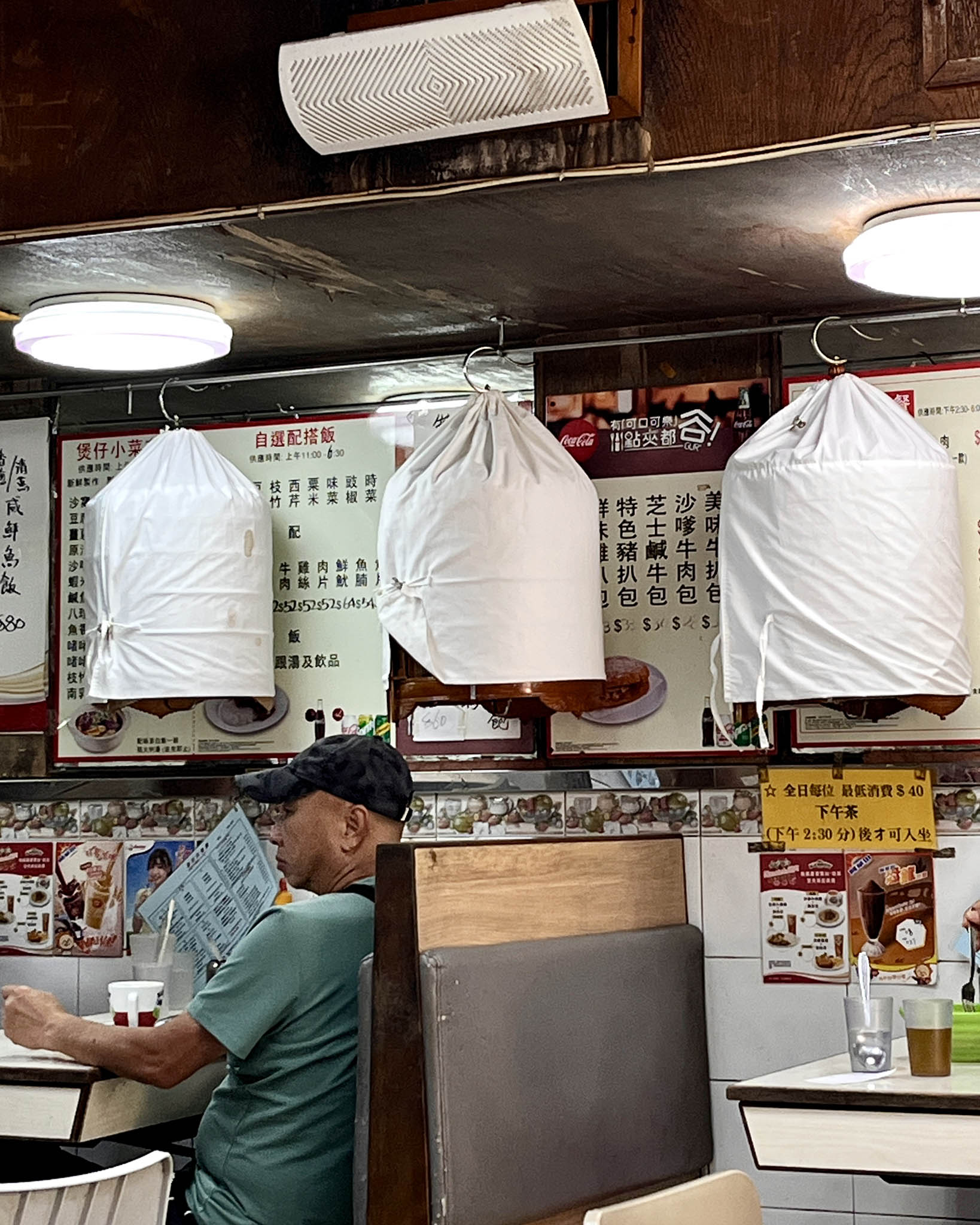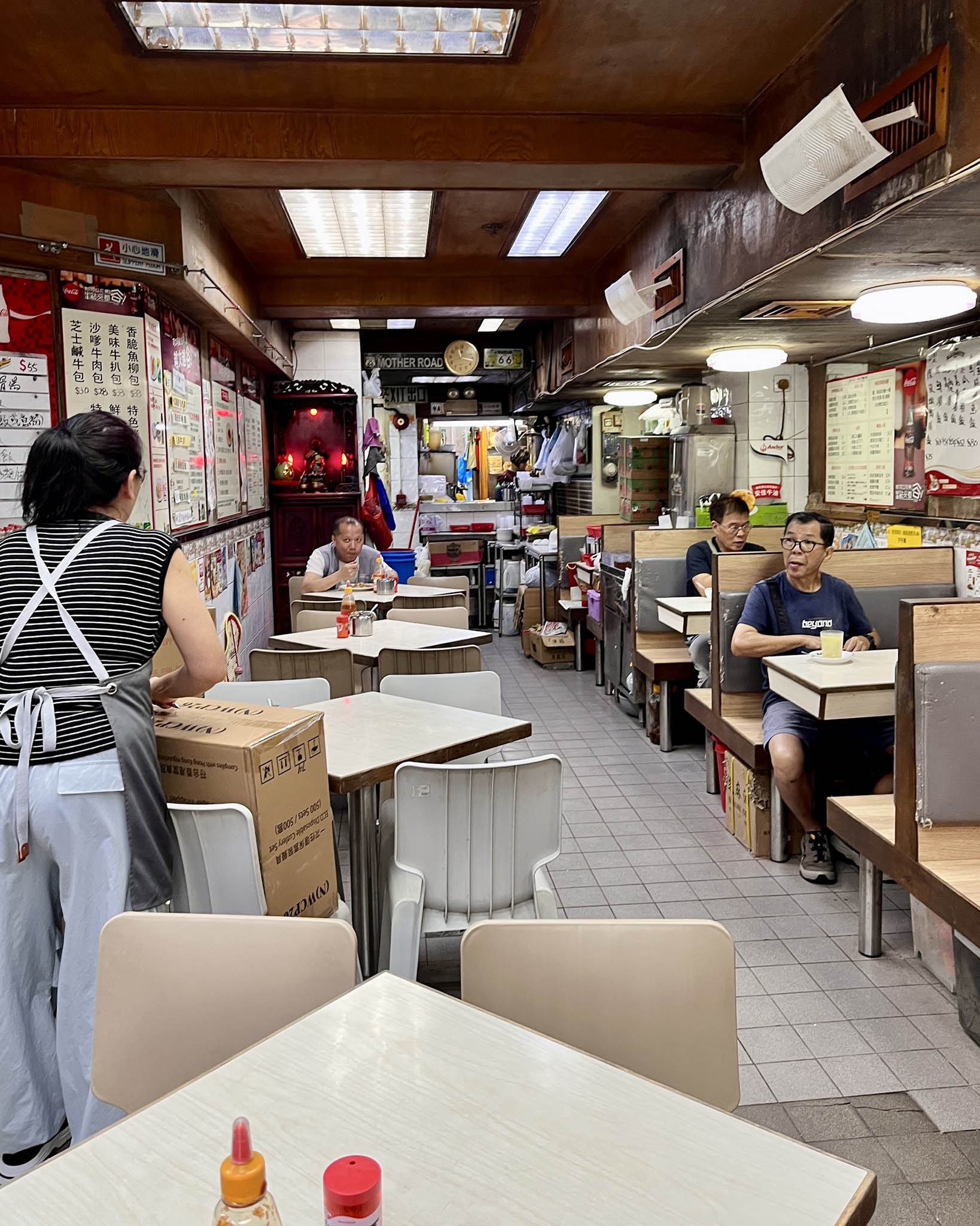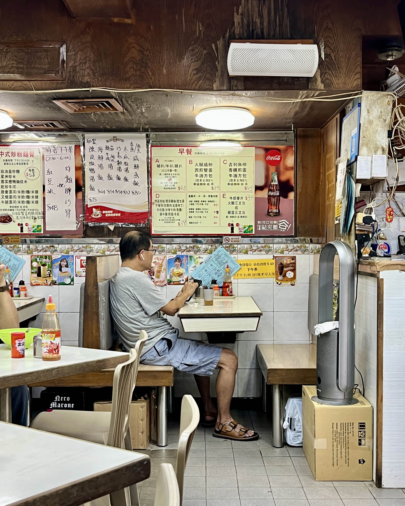 在早上到訪濠苑,便踫上有一、兩枱食客都帶上雀籠歎早餐,且與老闆和店員有講有笑。唯有像這樣街坊式的地道茶記,才會特地掛起一條鐵管方便食客將雀籠掛起來,也沒有QR Code落單、沒有自助水吧、沒有圖文並茂的花巧餐牌,只有熟客與店員的無聊玩笑,左一句「大家姐今日好靚」,右一句「皇上,你今日食咩呀?」卻予人日常又親切的感覺。