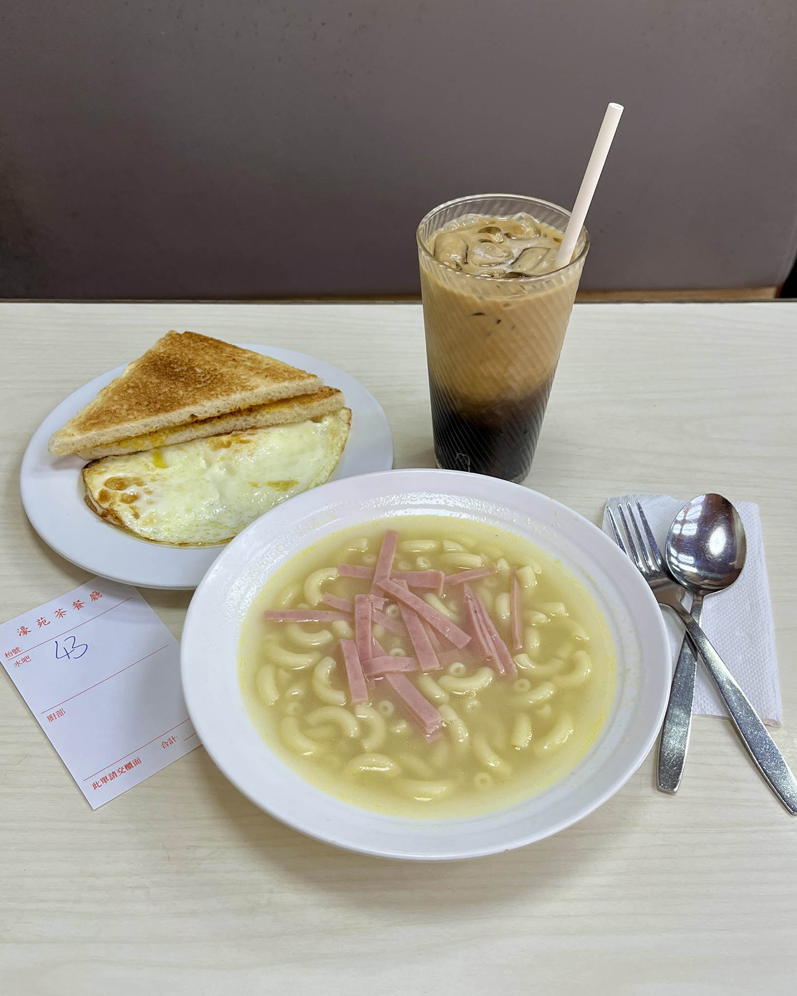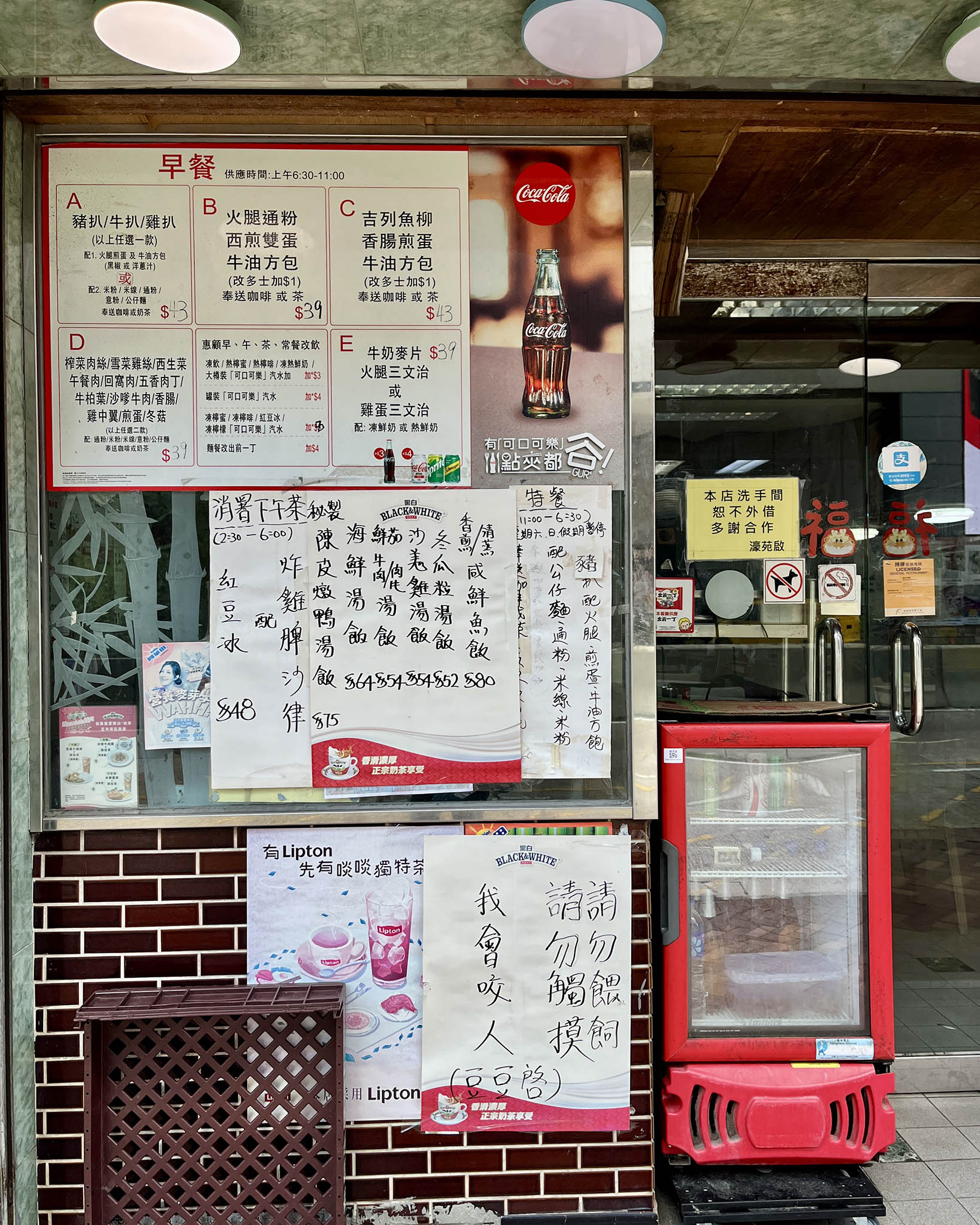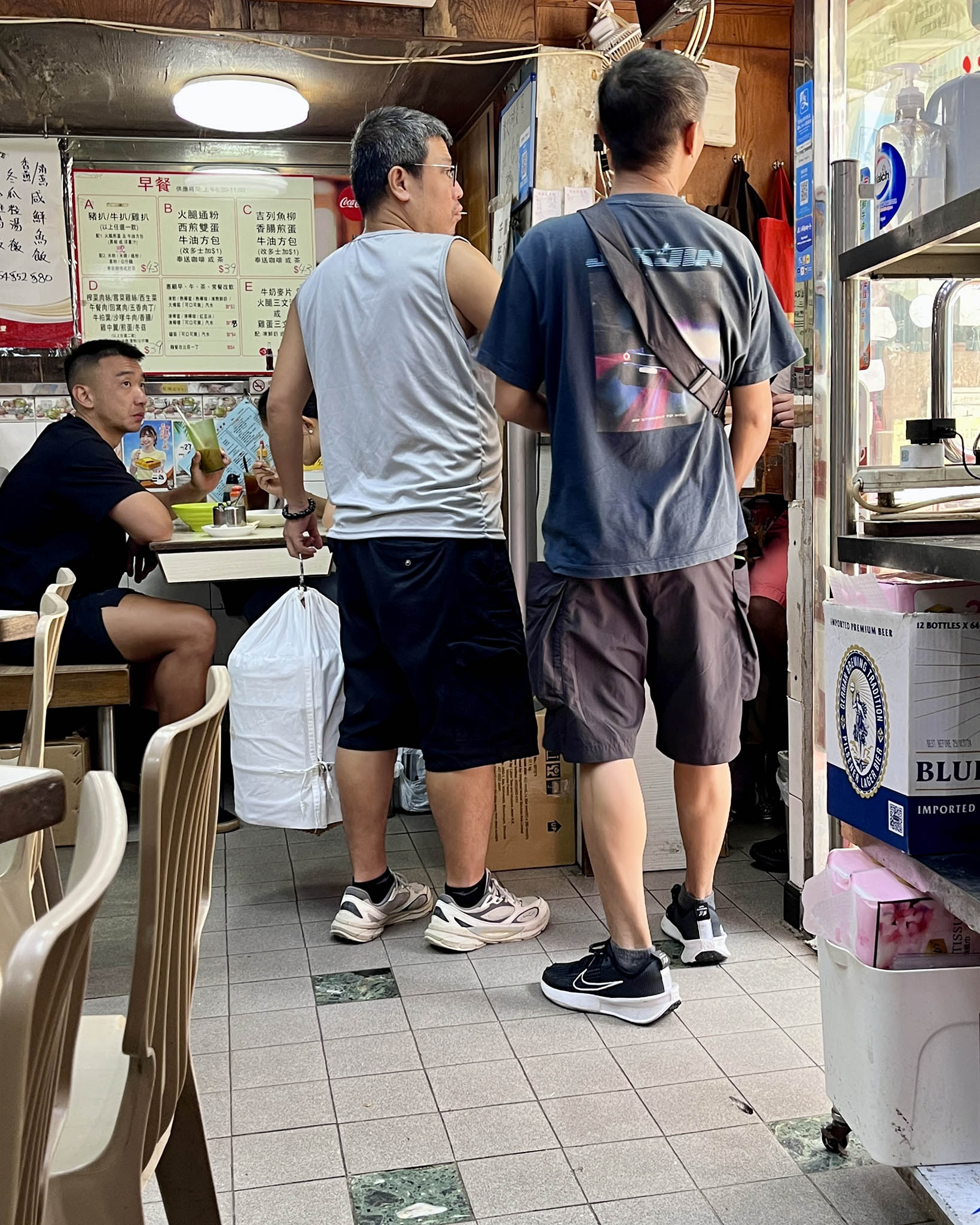 在早上到訪濠苑,便踫上有一、兩枱食客都帶上雀籠歎早餐,且與老闆和店員有講有笑。唯有像這樣街坊式的地道茶記,才會特地掛起一條鐵管方便食客將雀籠掛起來,也沒有QR Code落單、沒有自助水吧、沒有圖文並茂的花巧餐牌,只有熟客與店員的無聊玩笑,左一句「大家姐今日好靚」,右一句「皇上,你今日食咩呀?」卻予人日常又親切的感覺。