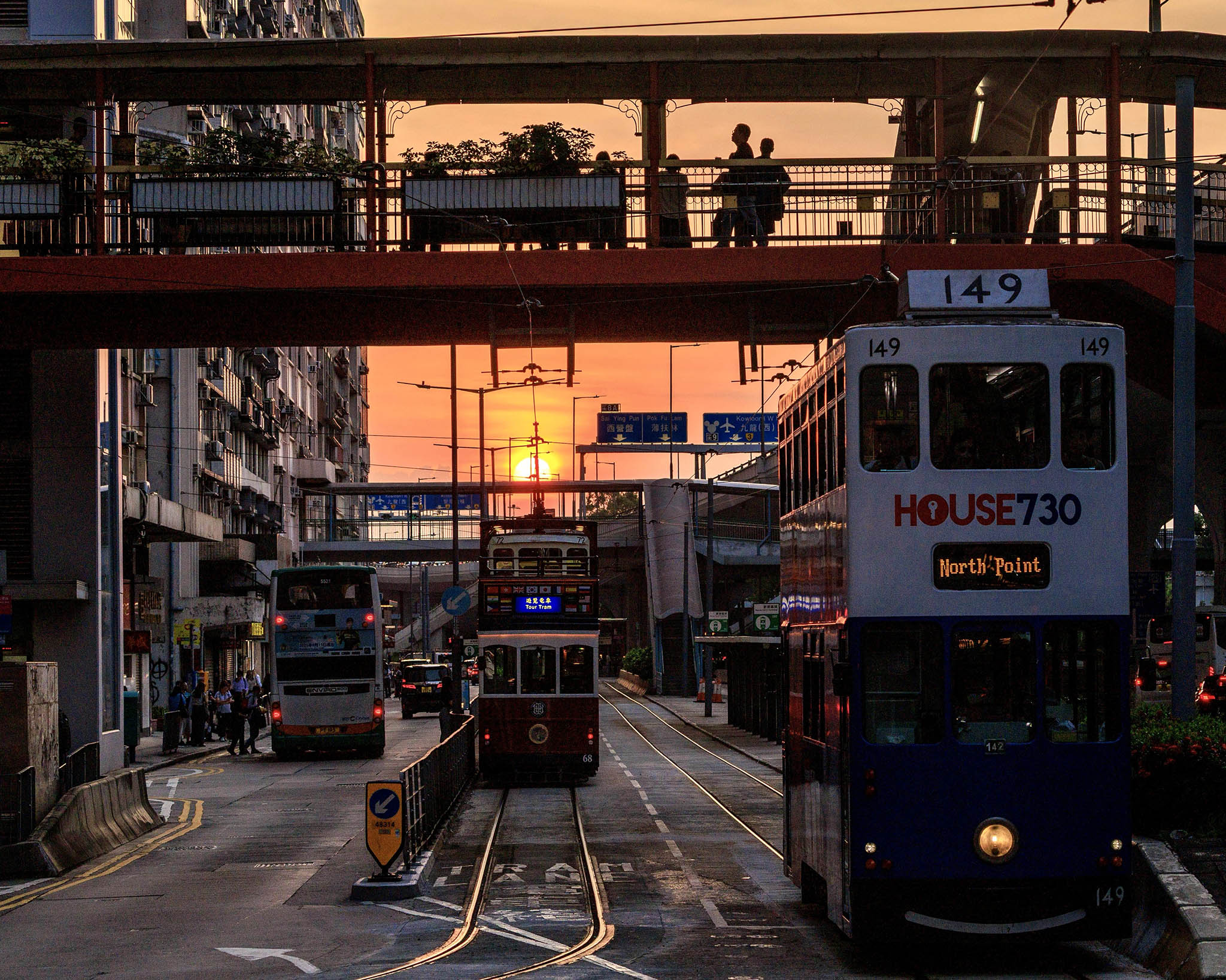 若想感受昔日港島區的「日落大道」,則可以改搭電車——電車路線乃是沿著二十世紀初未填海前的港島海岸線而建。搭上西行電車朝西環及堅尼地城方向緩緩向前,今日雖然電車路兩旁已建起不少高樓,但部分路段仍可以感受「鹹蛋黃」被大樓與天橋左右包夾的城市景觀。在懷舊叮叮聲的襯托底下,甚至可以幻想一下電車仍然沿著海旁行走、未有高架橋和摩天大樓的舊香港。對比起21世紀日復日轉變的城市面貌,似乎唯有日落不變。