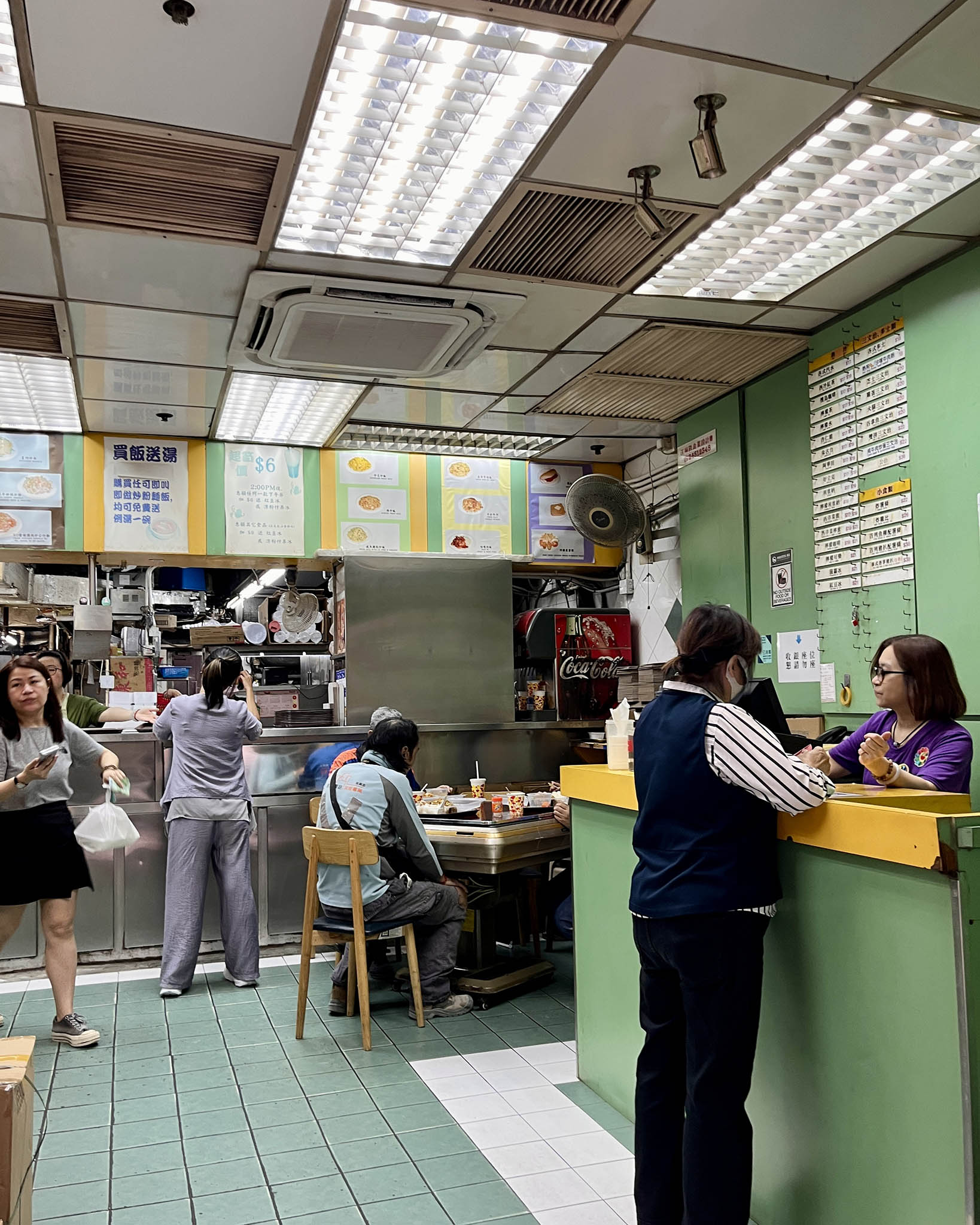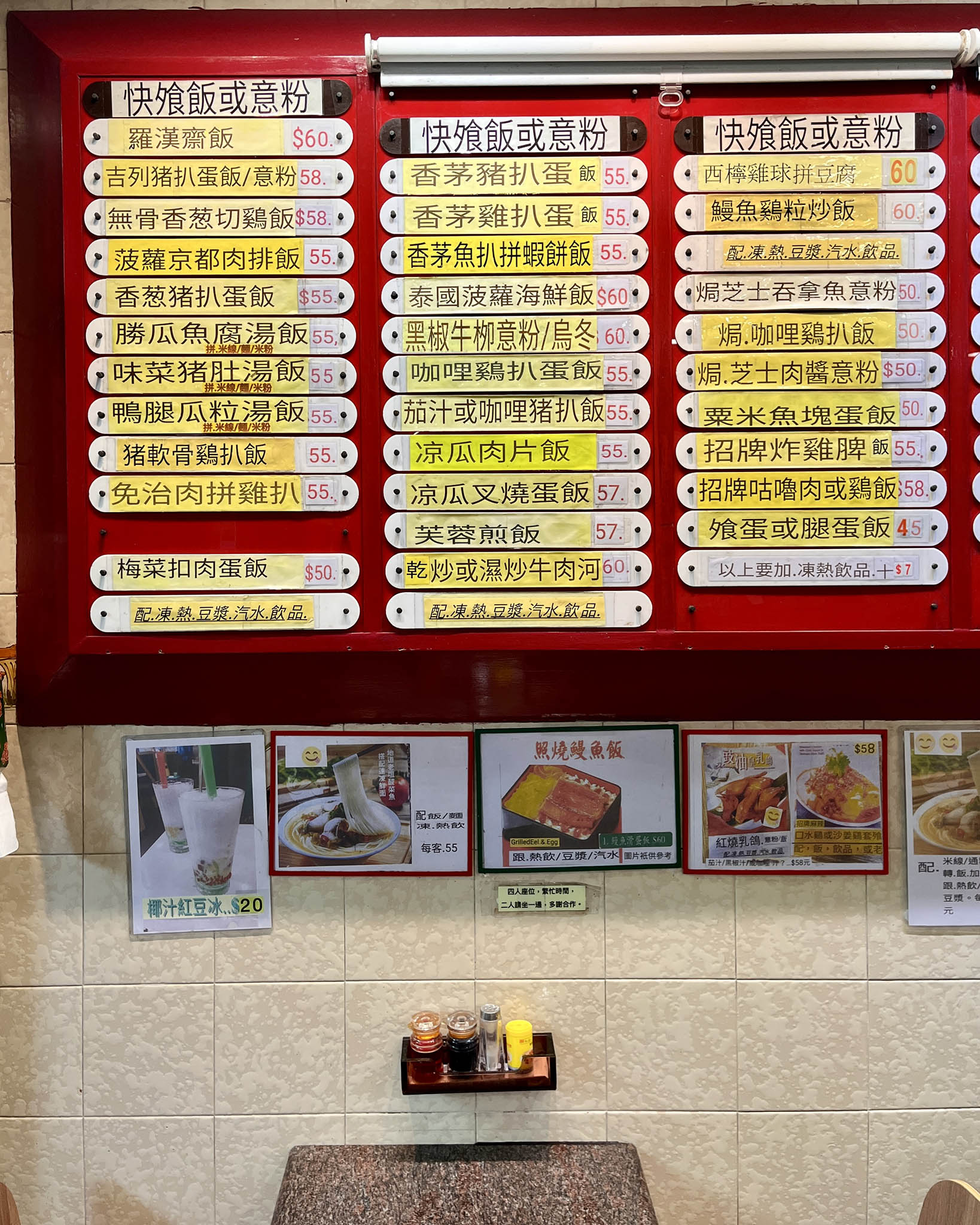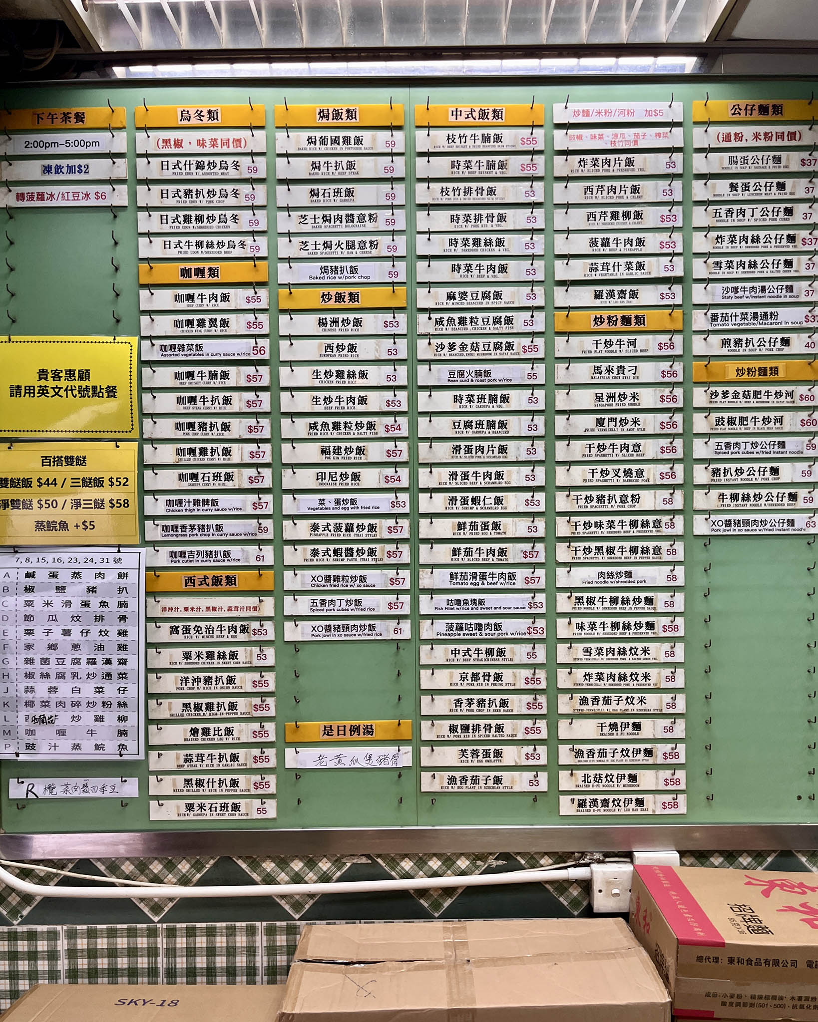 當中,有一間港式快餐店門面尤為特別——綠色的小遮篷上印著「新興美食」的店名,快餐店外牆和店內裝潢,均以綠色和白色作為主調,店外及收銀處前亦掛滿一塊塊白色字牌,形成了一面「餐牌牆」,展示當天提供的午餐精選及常備菜式。餐牌中不難看見「碟頭飯」的蹤影,又加上各類中式粉麪——即使當天的午餐精選不合心意,也有其他菜式任君選擇。