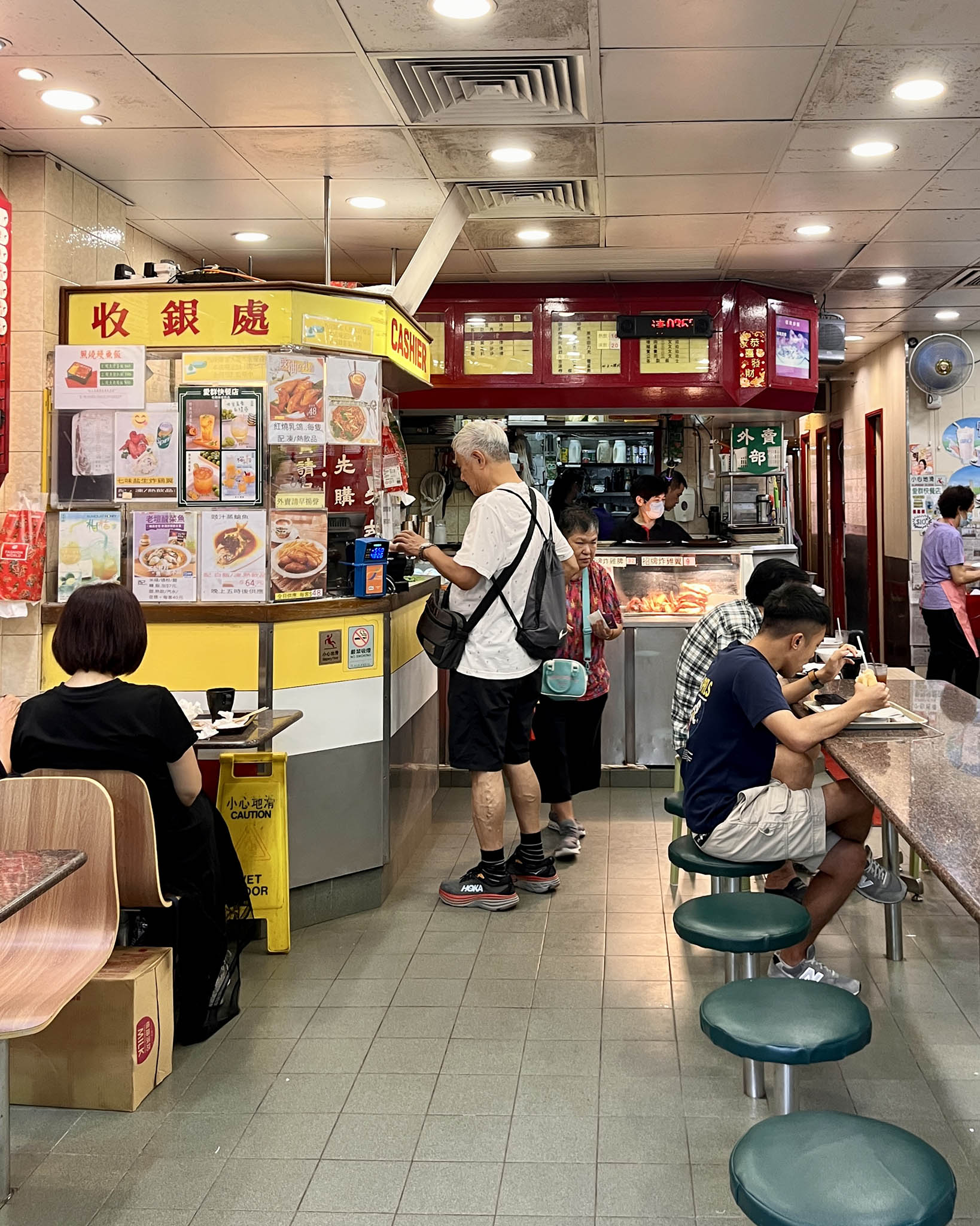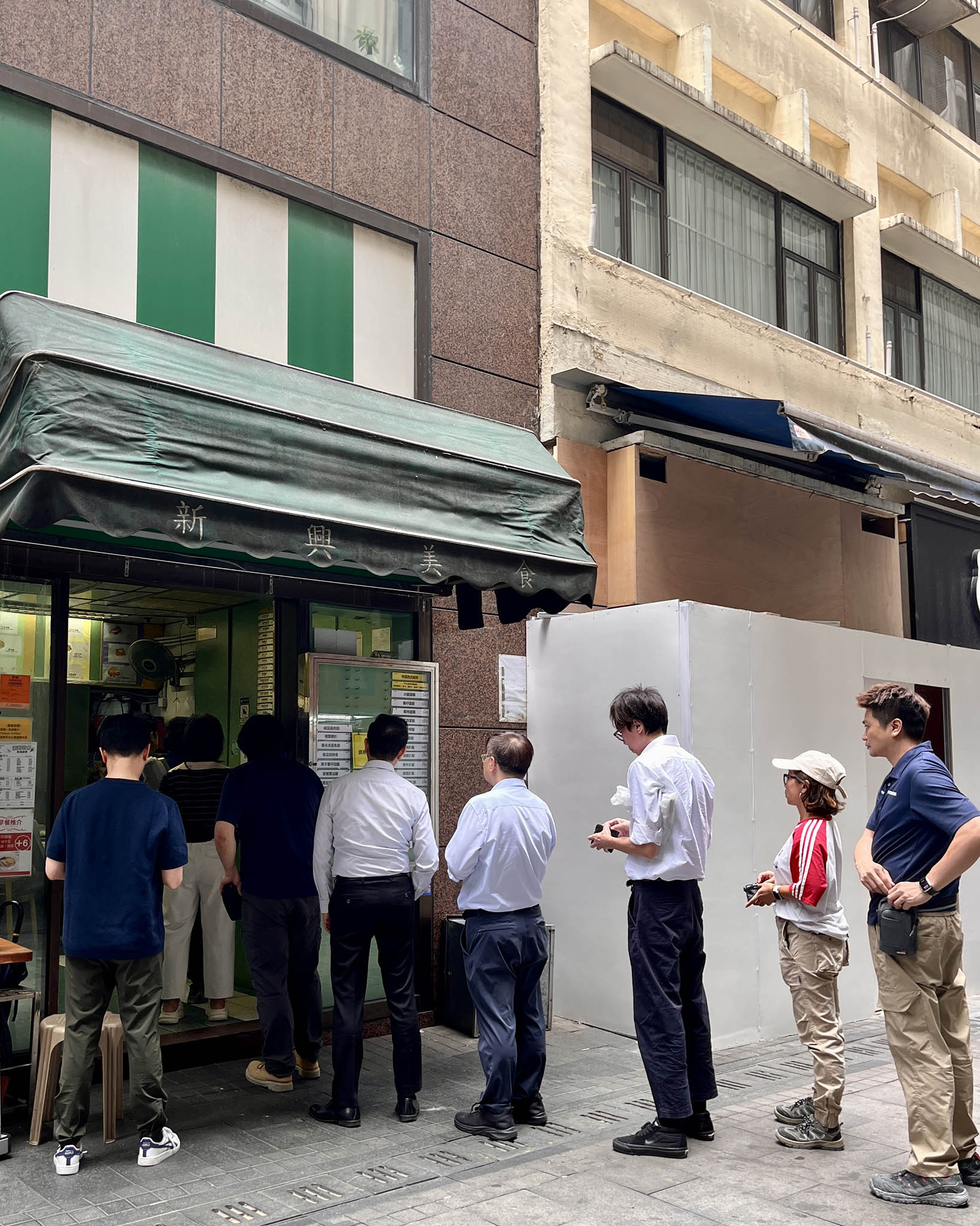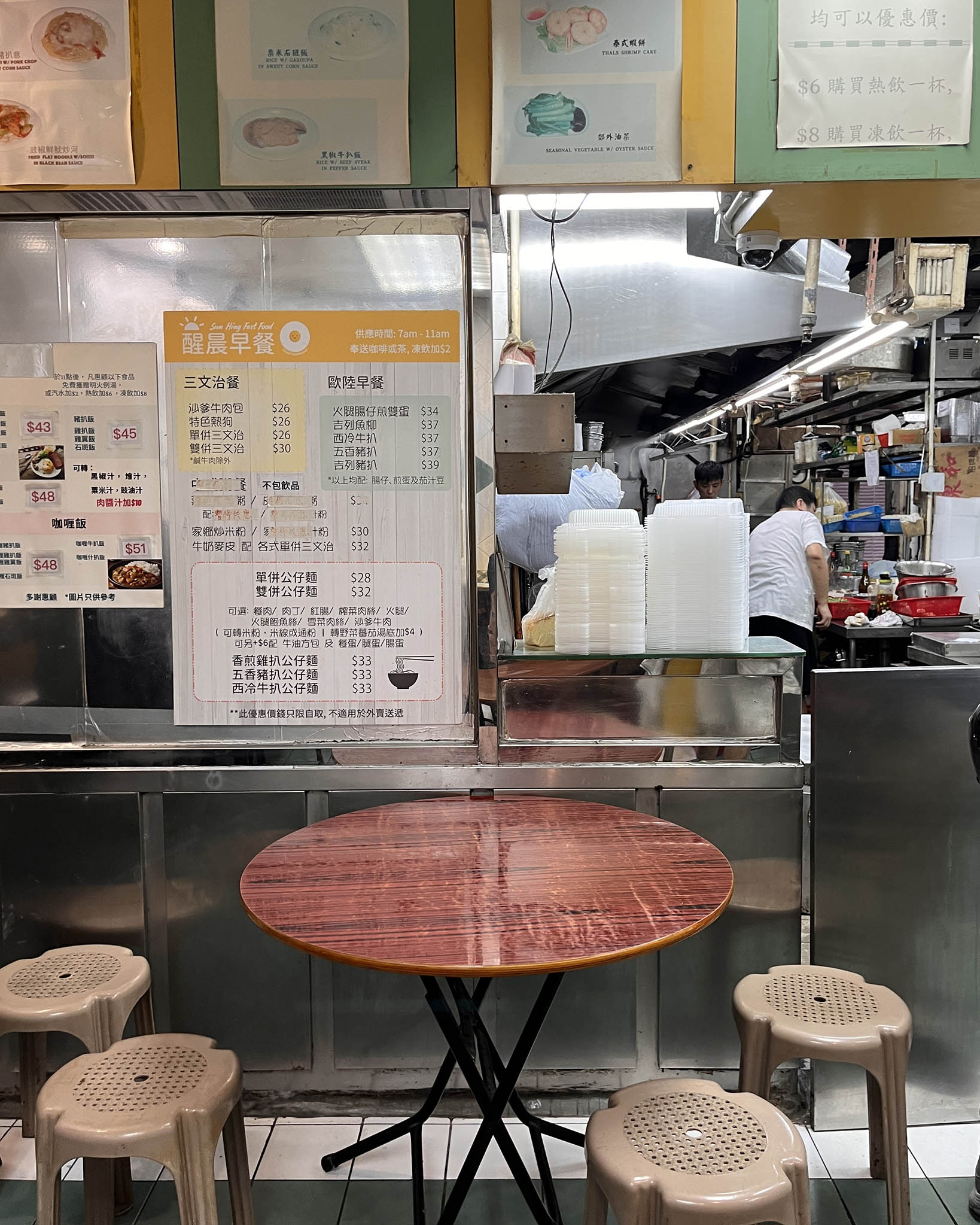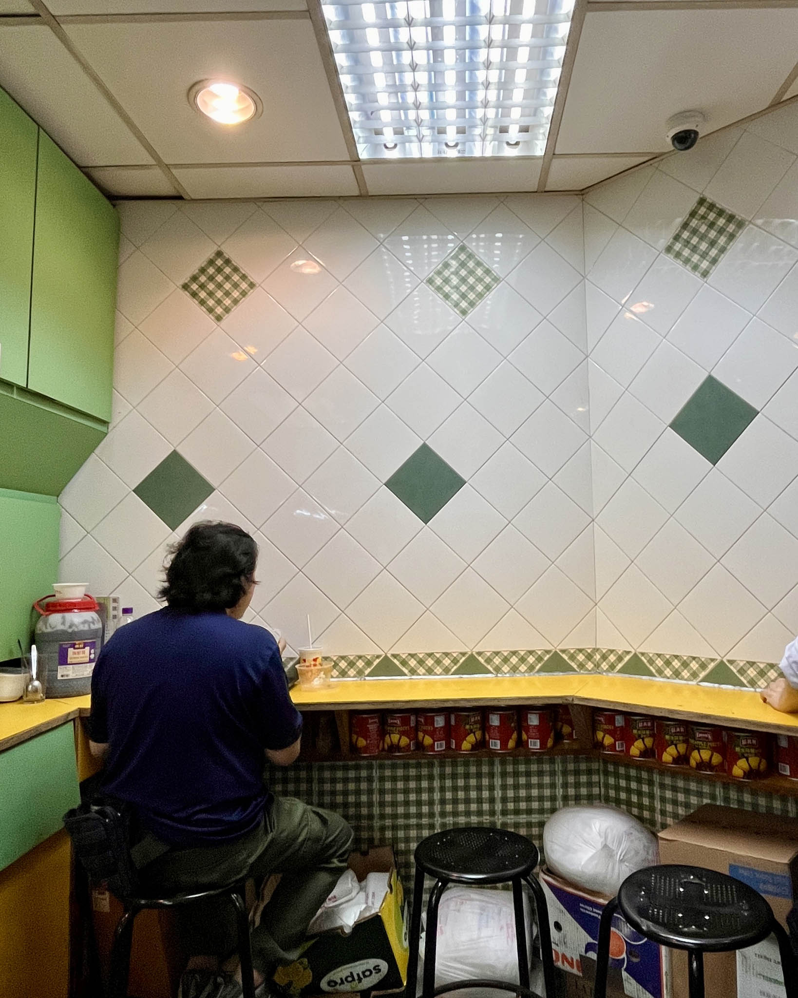 當中,有一間港式快餐店門面尤為特別——綠色的小遮篷上印著「新興美食」的店名,快餐店外牆和店內裝潢,均以綠色和白色作為主調,店外及收銀處前亦掛滿一塊塊白色字牌,形成了一面「餐牌牆」,展示當天提供的午餐精選及常備菜式。餐牌中不難看見「碟頭飯」的蹤影,又加上各類中式粉麪——即使當天的午餐精選不合心意,也有其他菜式任君選擇。