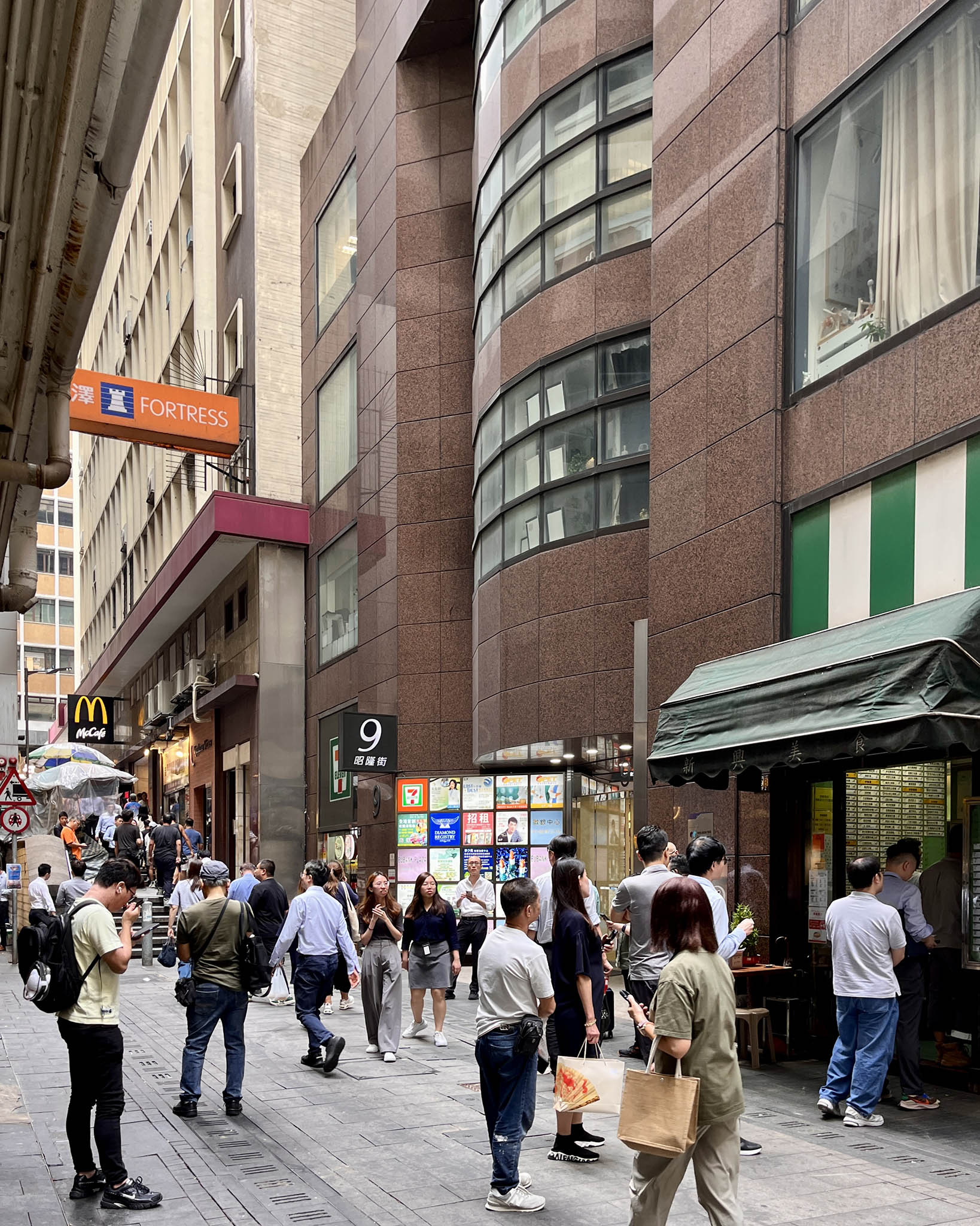 在中環商業區的午飯時間,「放飯」人潮不斷——一眾「打工仔」以極速的步伐,務求可以盡快到達餐廳用膳,又或者買外賣回公司享用,以免排隊等候的時間。昭隆街一帶便是區內所熟悉的「食街」之一,街上不但有麥記,還有七家不同類型的食肆,吸引不少人選擇到這條橫街吃午飯或購買外賣。