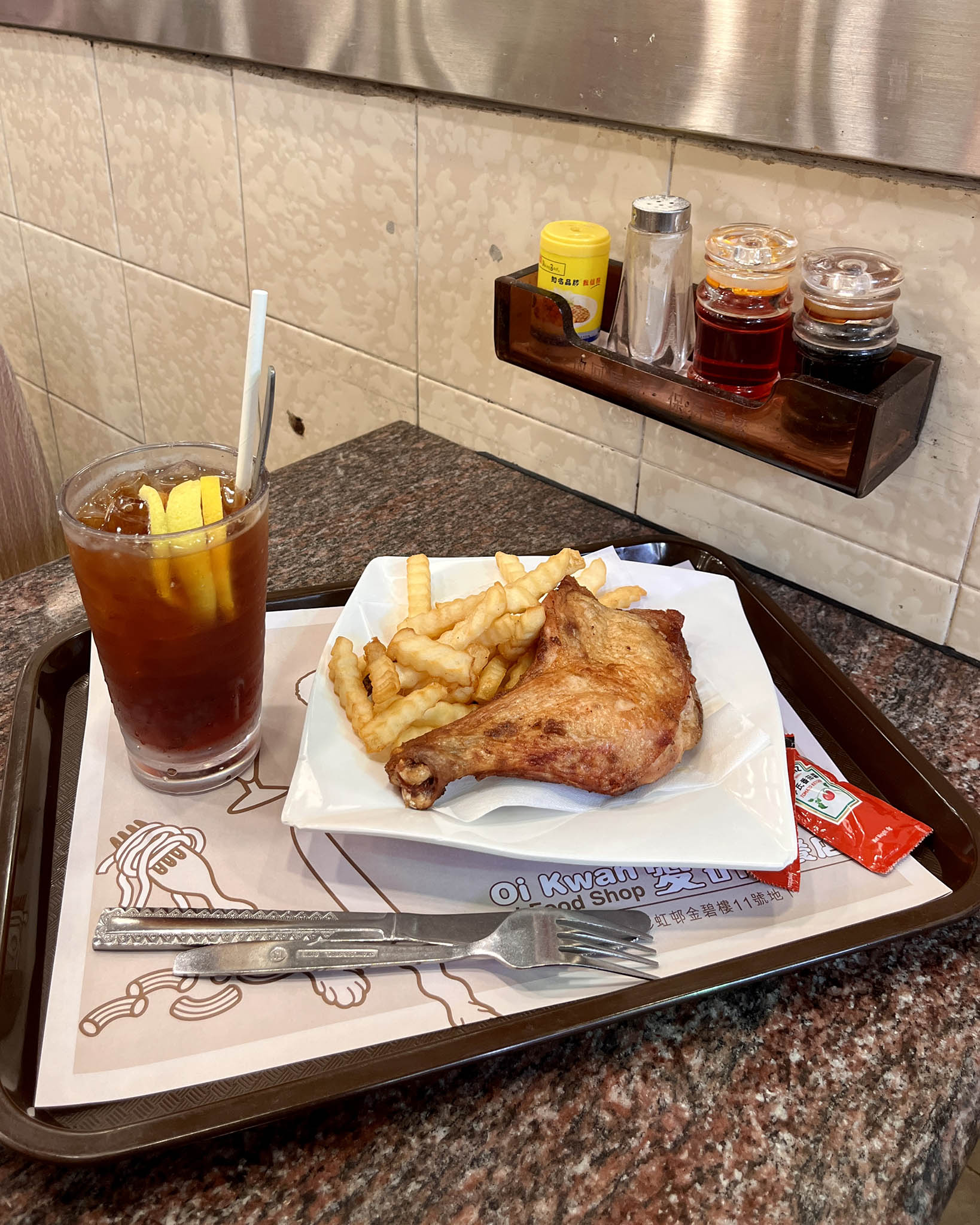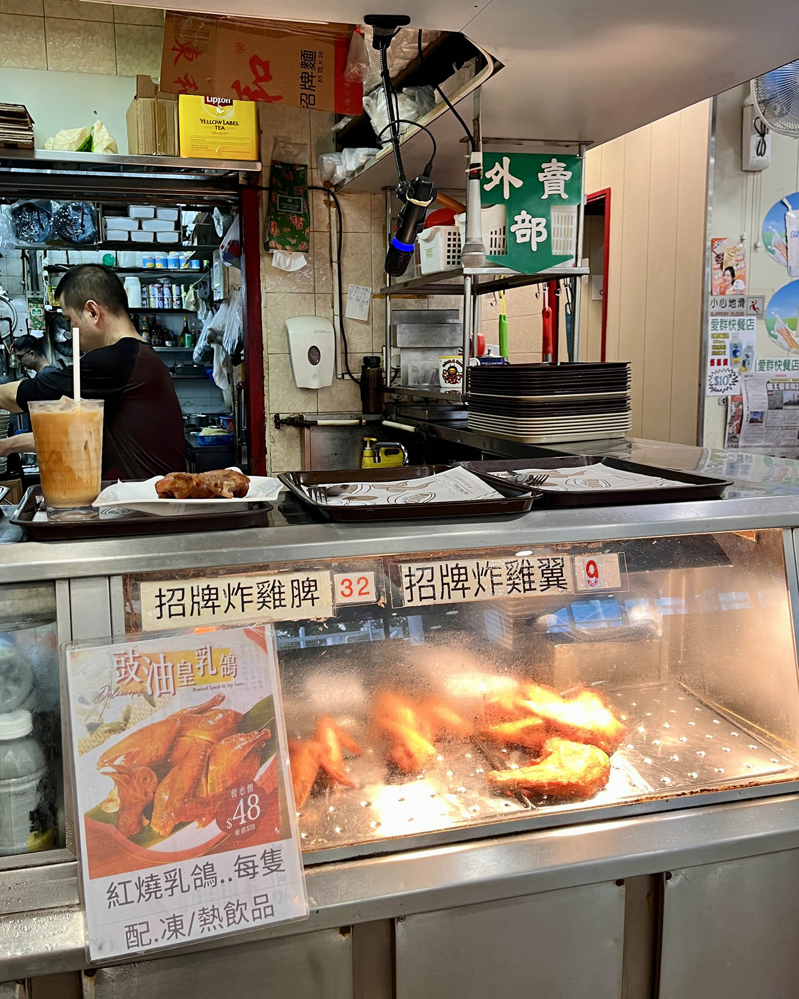 餐牌上除了常見的「碟頭飯」,有別於以午市為主的商業區,這裡也有供應糖水及晚市限定的小菜套餐。數到愛群快餐店的招牌菜式,無疑是炸雞髀及炸雞翼——酥脆的外皮,內裡柔軟多汁。要做到外脆內軟,除了食材,也考驗廚師功夫。炸雞髀及炸雞翼均為常客所喜愛,更有饕客慕名而來。近期亦有很多市民趁快餐店將隨著彩虹邨拆卸而結業之前,前來回味港式快餐的味道。