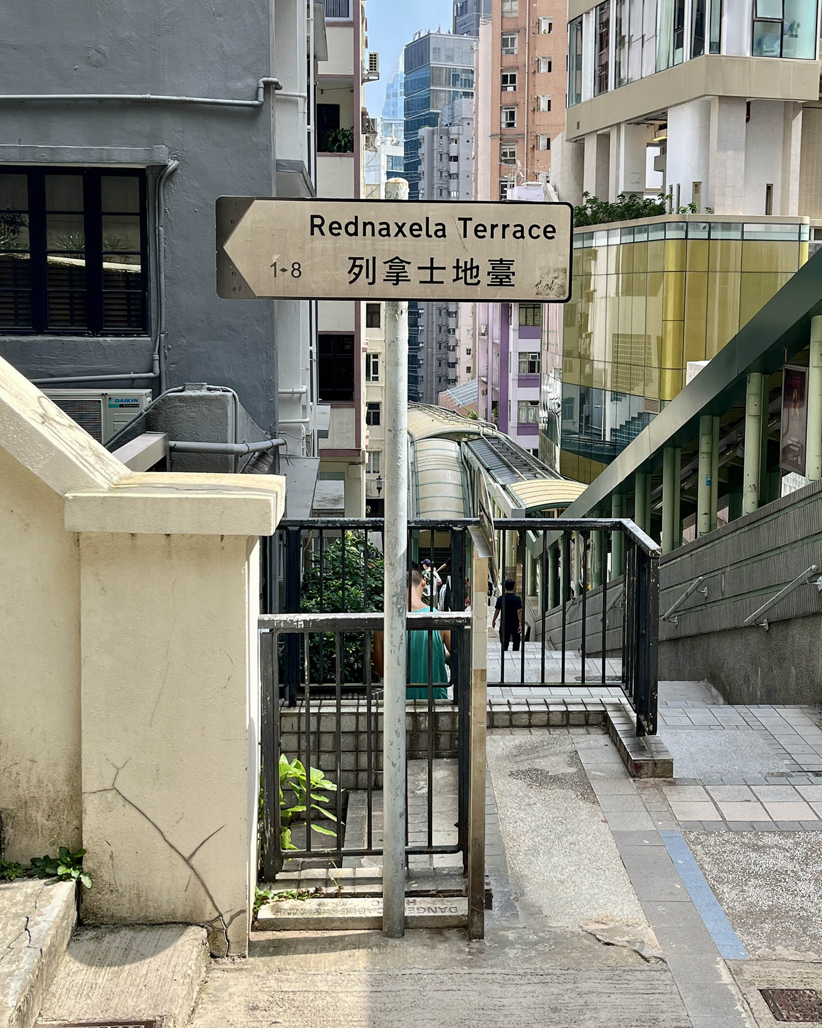 另一個例子是半山區的列拿士地臺(Rednaxela Terrace),Rednaxela這個陌生的英文字,其實是Alexander的倒拼,坊間一直傳聞,因為當時負責翻譯的華人,習慣由右向左書寫,於是出現這個「烏龍」,政府也從未解釋或更正,所以便一直沿用至今。在網上搜尋Rednaxela,所有搜尋結果指向列拿士地臺,Rednaxela一字也成為了香港獨有的英文字。