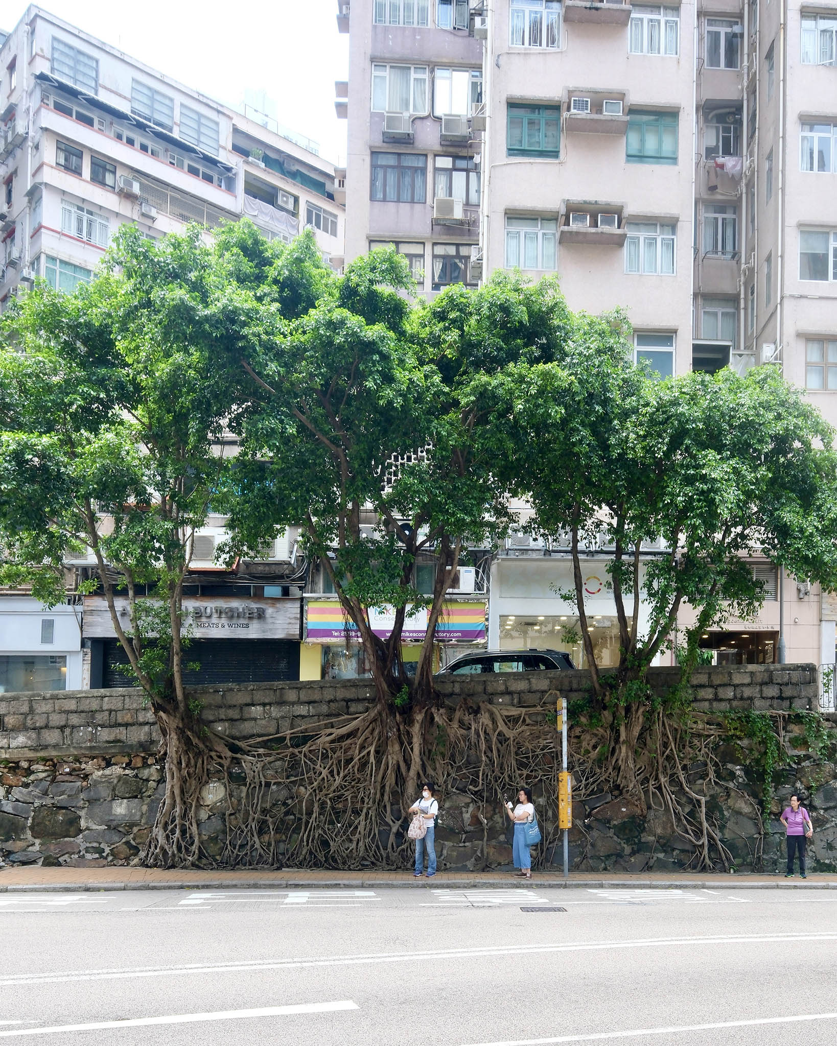 但並非所有石牆都會長出大樹,能克服環境限制的,卻又往往在城市擴張過程中,被剪去鬚根或者切斷枝幹,變得衰弱殘缺,更令那些奮力求存而茁壯成長的石牆樹變得彌足珍貴。石牆樹也成為本地藝術家鄧啟耀 @tangkaiyiufrank的創作養份。一直在作品中探討香港的城市景觀、展示景物背後有關殖民化、城市化,以及歷史事件對地方面貌造成的改變,藉著中環城隍街和灣仔東美花園兩地的石牆樹,呈現自然和社區的連結。
