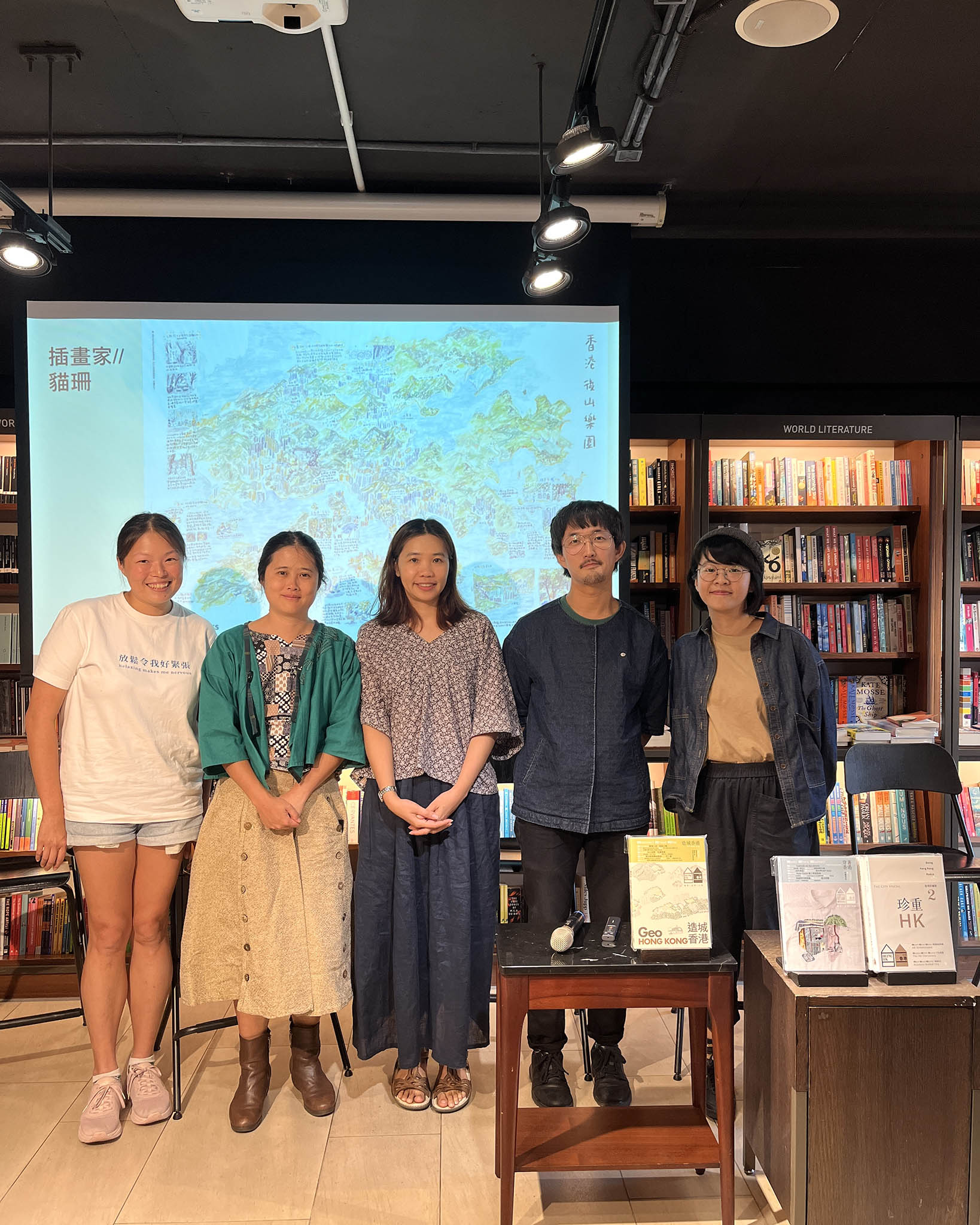 秋季號《就係香港》隨書附送的「香港後山樂園」手繪地圖海報,以插畫地圖方式呈現香港後山的空間,從而思考當中的各種可能性。在剛過去的周日(11月2日 ),「就係香港」邀請有份參與書中「城中小丘」專題創作的「生活營造」團隊、保育本地自然生態的Parks and Trails ,以及插畫家貓珊 ,在誠品尖沙咀店和讀者面對面,分享他們以不同角度和方式,重新發掘及記錄這片城市邊緣的綠化帶。