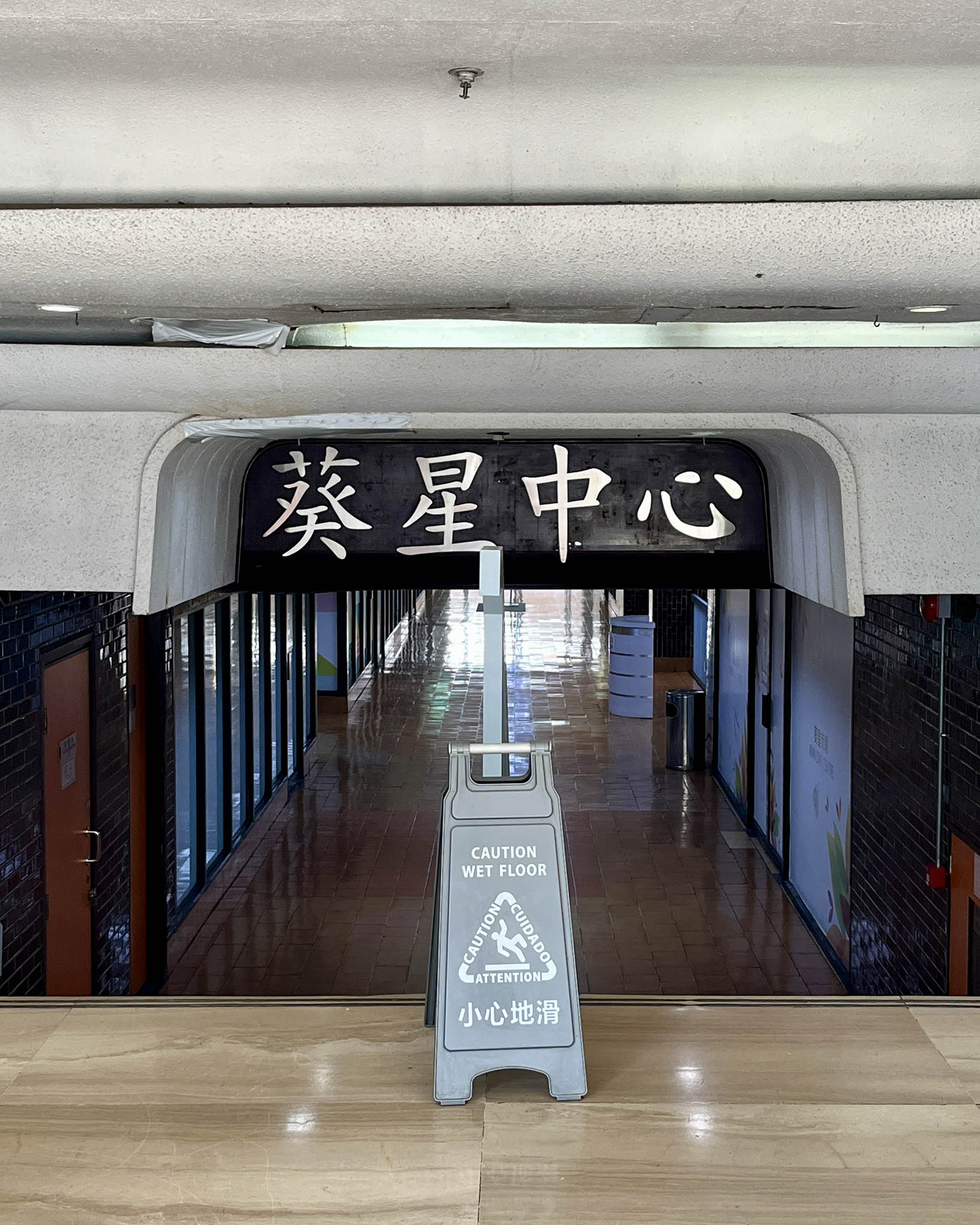 位於北葵涌的葵星中心商場,保留著八十年代「上居下舖」的舊式商場格局,內部裝潢亦充滿年代感——啡紅色牆磚的拼接紋路、暖黃色吊燈下的旋轉樓梯、暫停使用的電梯、工整又闊落的走廊通道⋯⋯都充滿了舊時代的韻味。