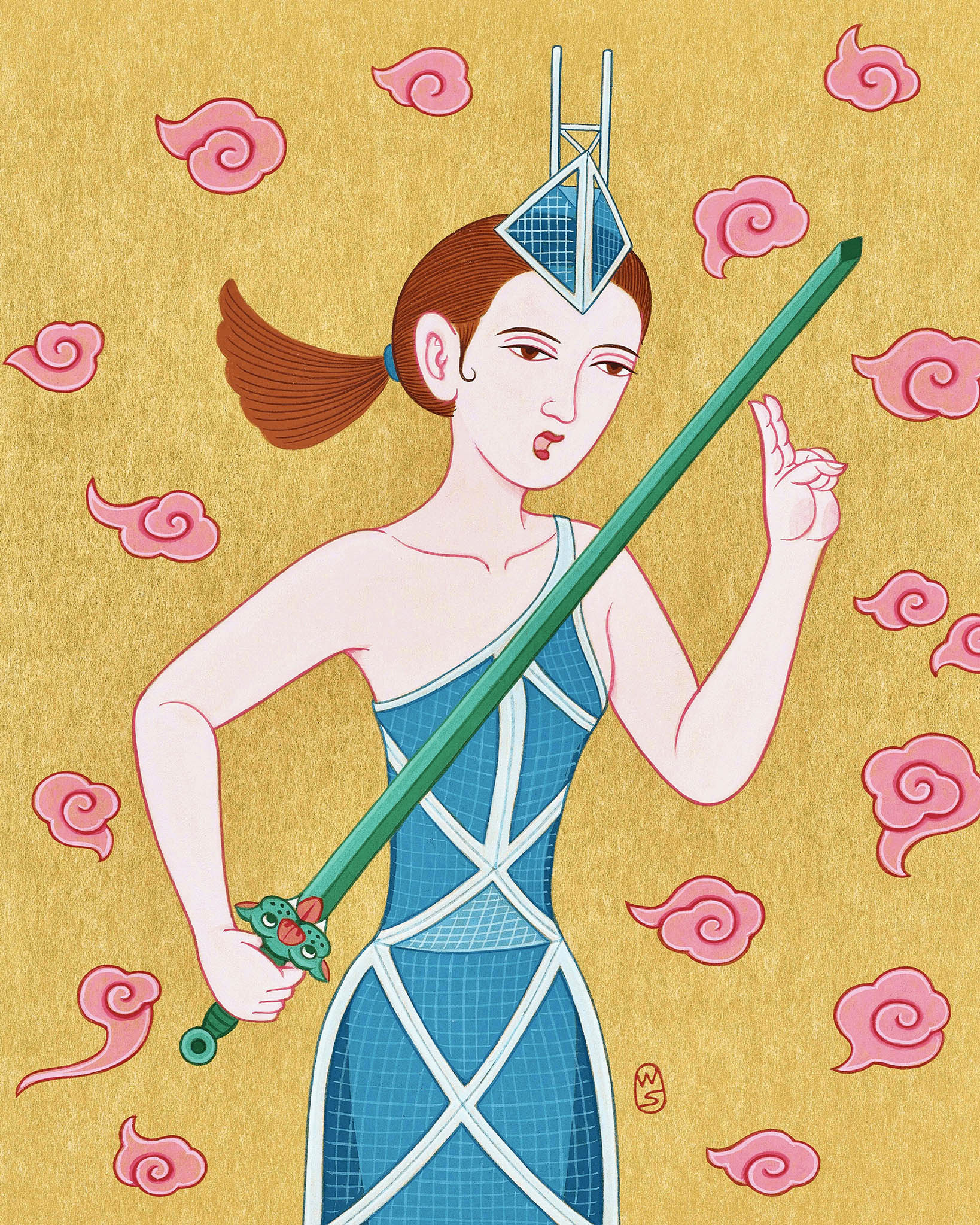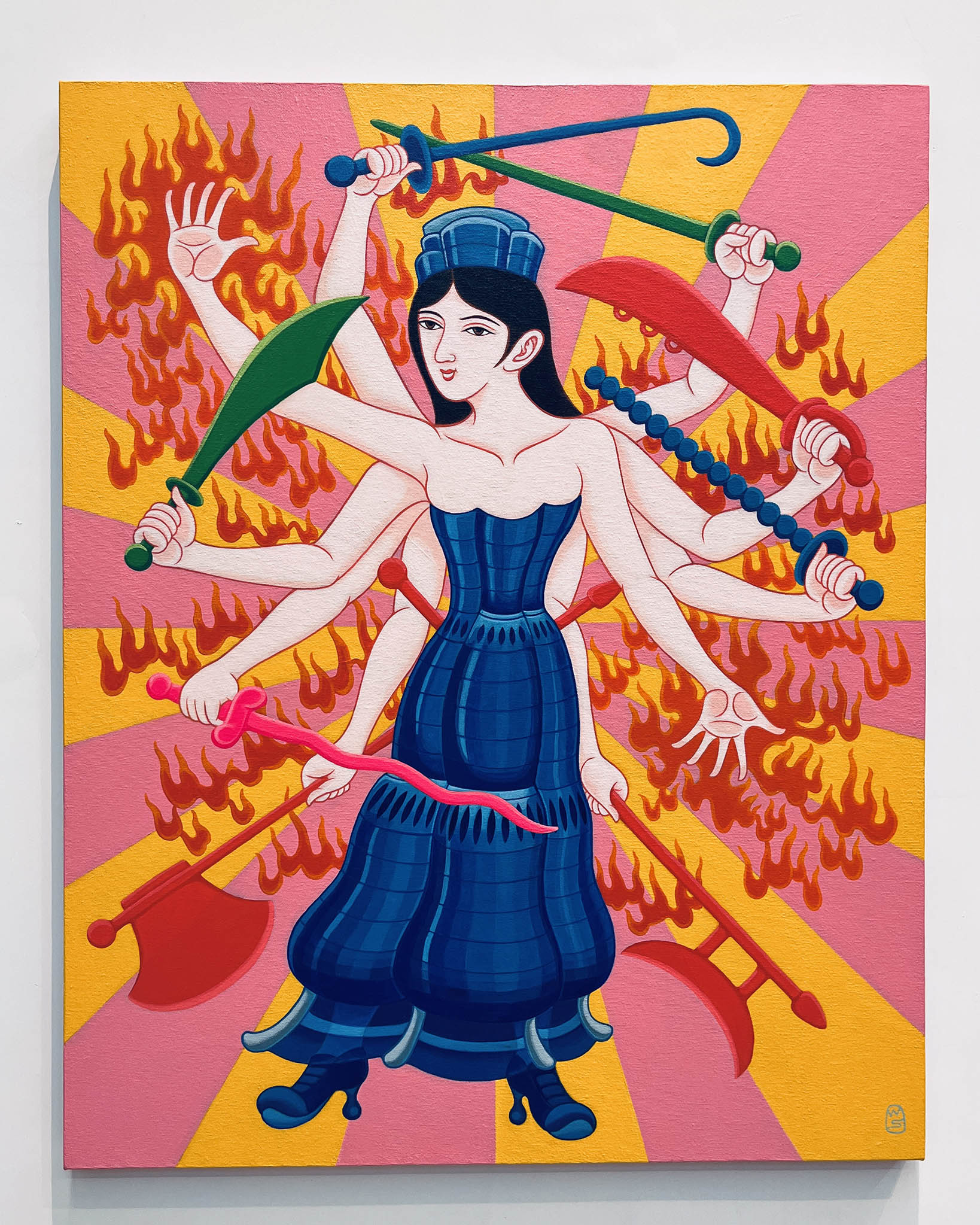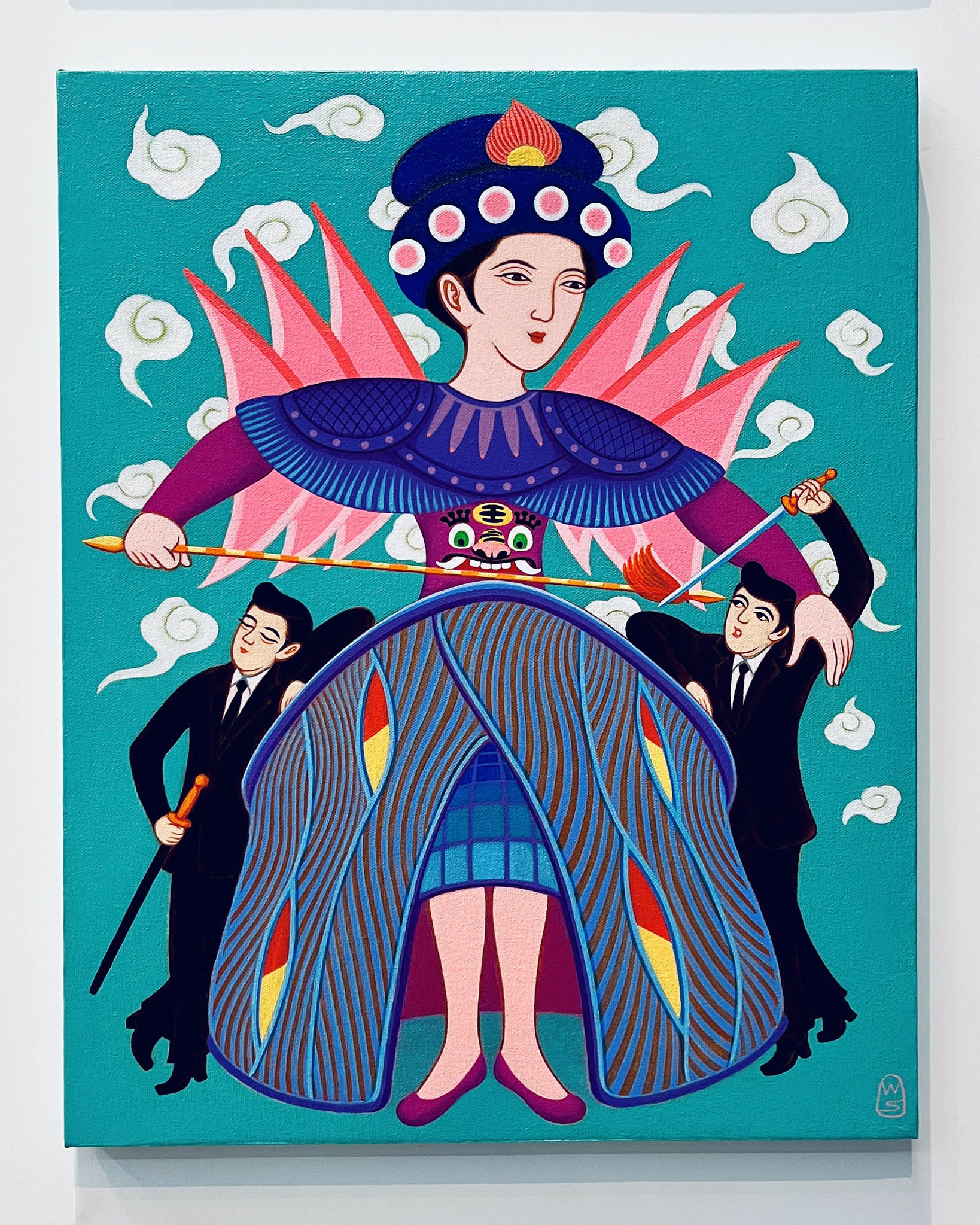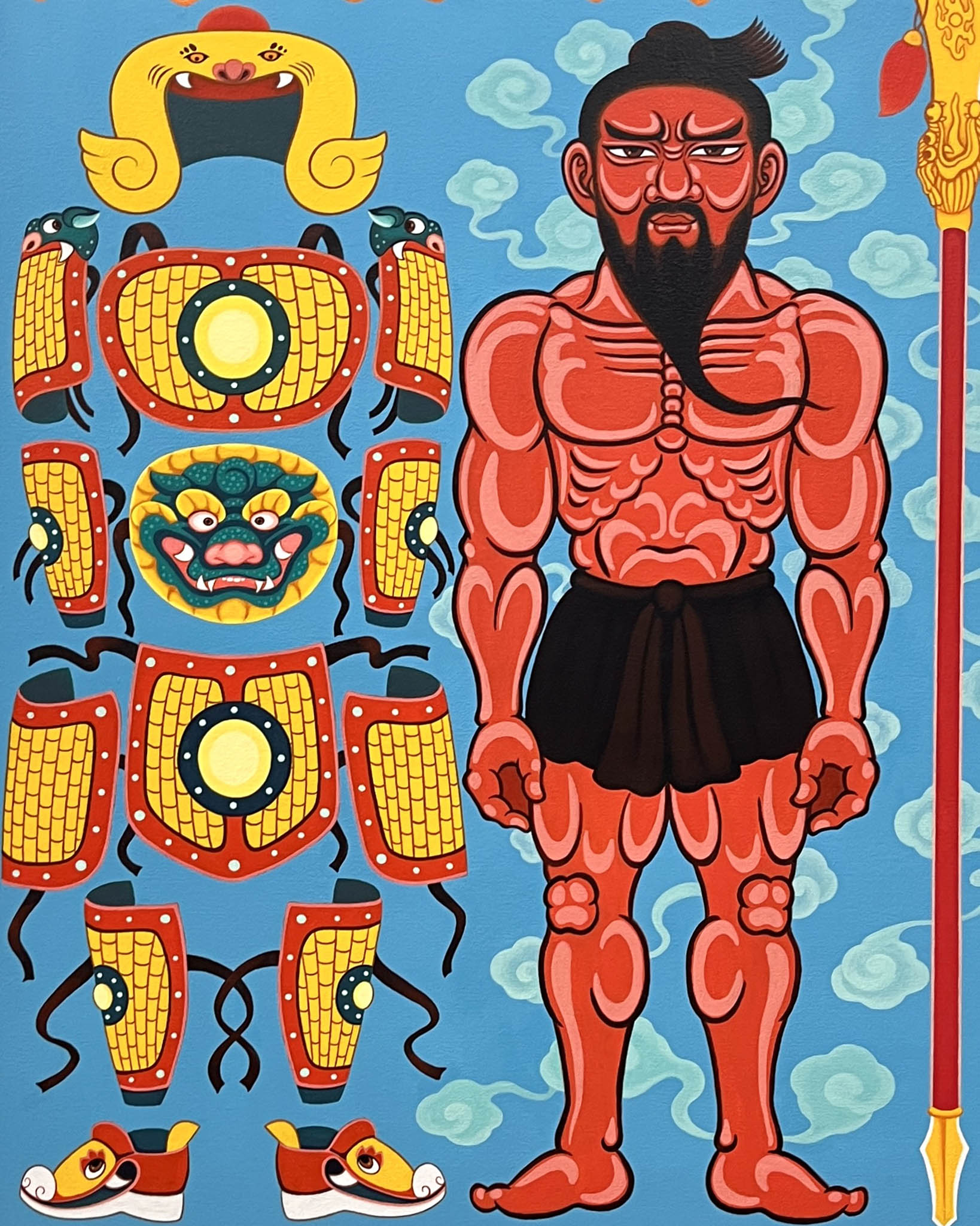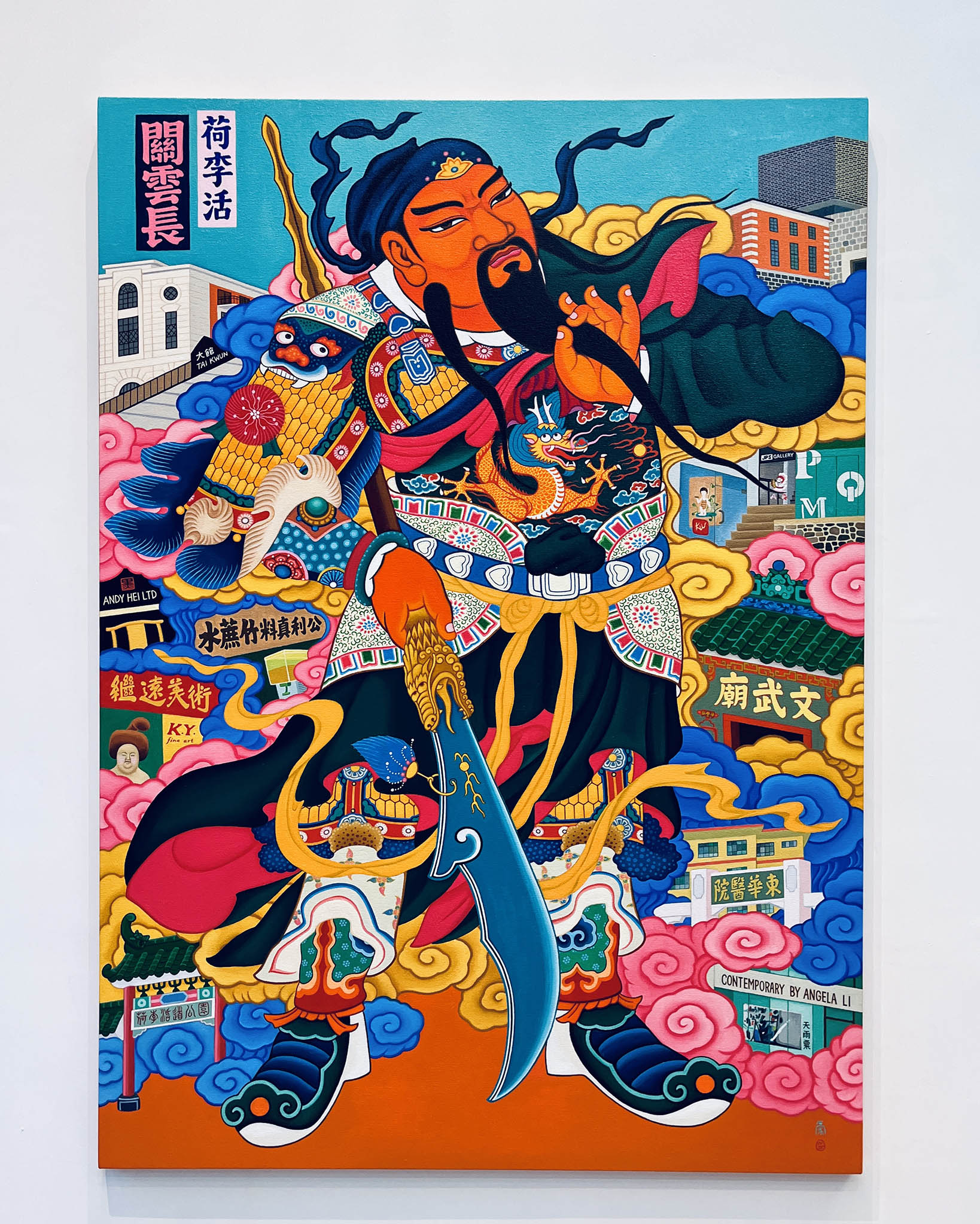 石家豪嘗試由關公的服飾及戰袍下的健碩身形開始,解構這位「硬漢子」的「構造」——作品《關公傷》和《關羽(仿浮世繪師歌川國芳)》,描繪了關公在家中療傷的模樣,甚至落下男兒淚的瞬間,呈現英雄形象背後隱藏的努力和苦功;《荷里活關雲長(甲辰年二月版)》的關公更來到現代——當不再需要上戰場殺敵,關公又會過著怎樣的生活?藝術家以此作為契機,想像若然關公有天落入凡間,會邀請他一同四處遊玩,甚至為關公準備一幅香港遊覽地圖,由荷李活道文武廟出發,參觀這條香港最早落成道路沿途上的歷史建築。