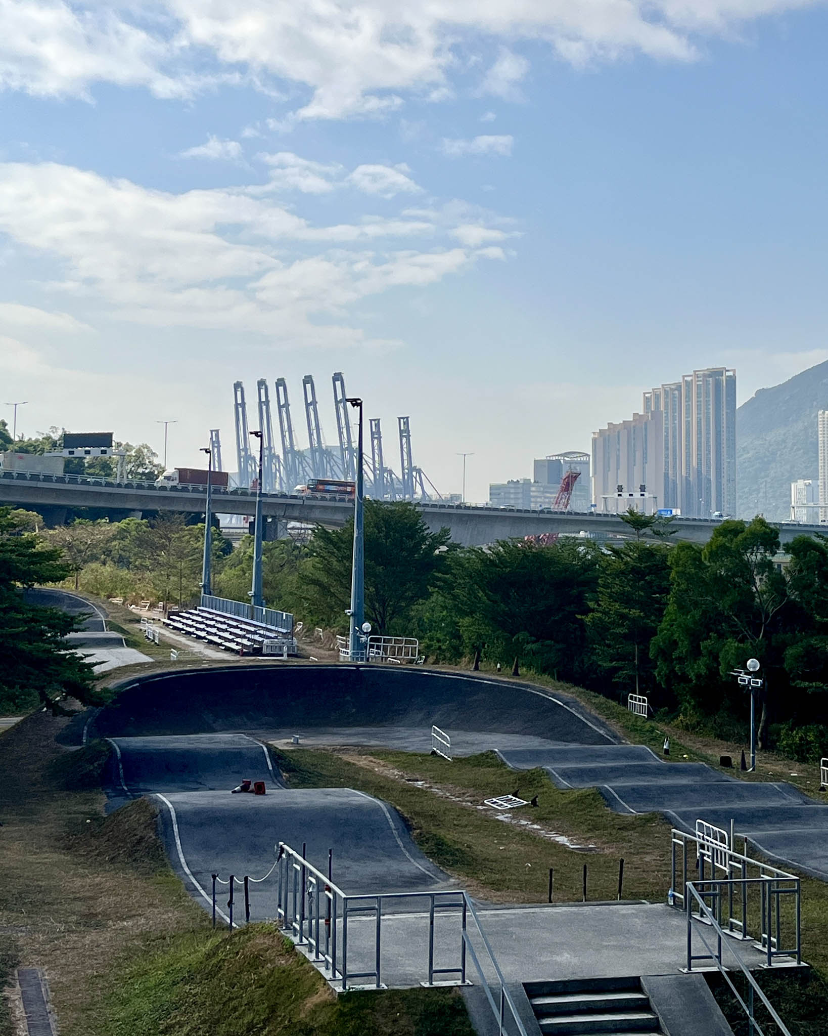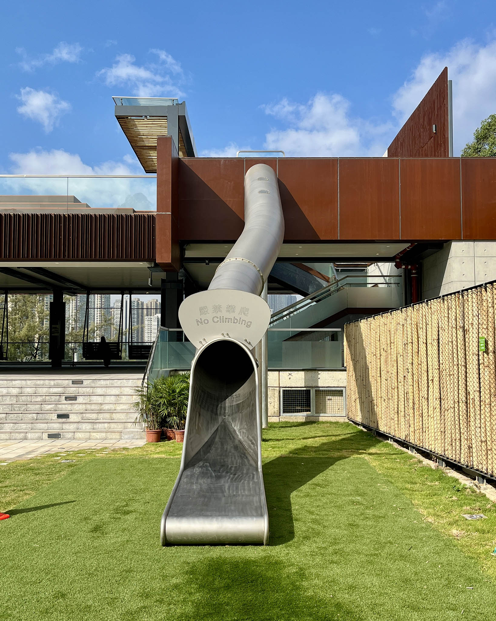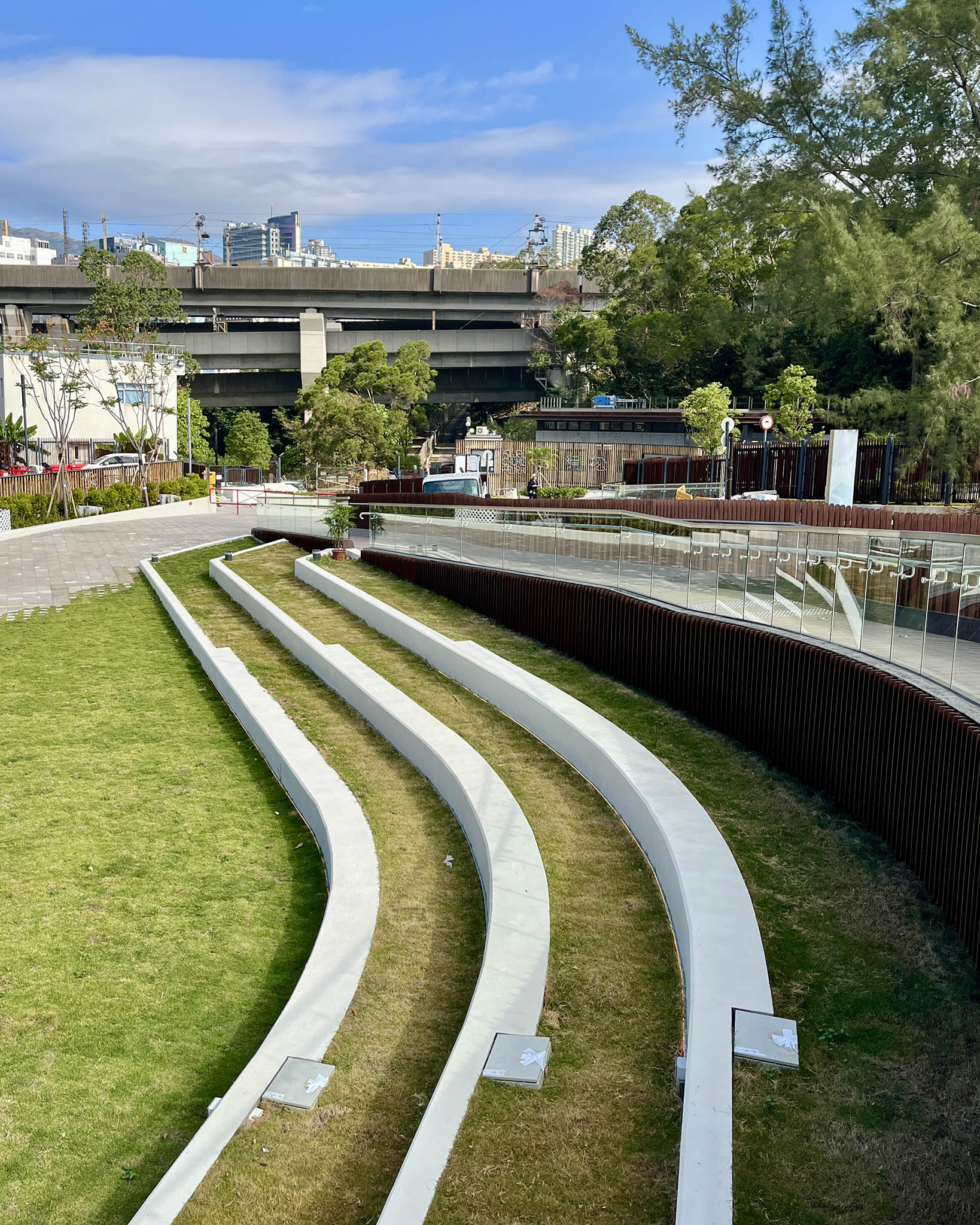 不過周遭的噪音問題卻稍稍破壞了這份寫意——鞦韆長椅和觀景台面向葵裕街的方向,正下方是一個回收場,重型機械運作的聲音不斷,而且因為鄰近工業區,大貨車經過的頻率甚高,不時傳來轟隆聲響。而在六個鞦韆長椅中,也只有最右方的兩個鞦韆享有無遮擋的景觀,其餘的都被樹木擋住前方風景。