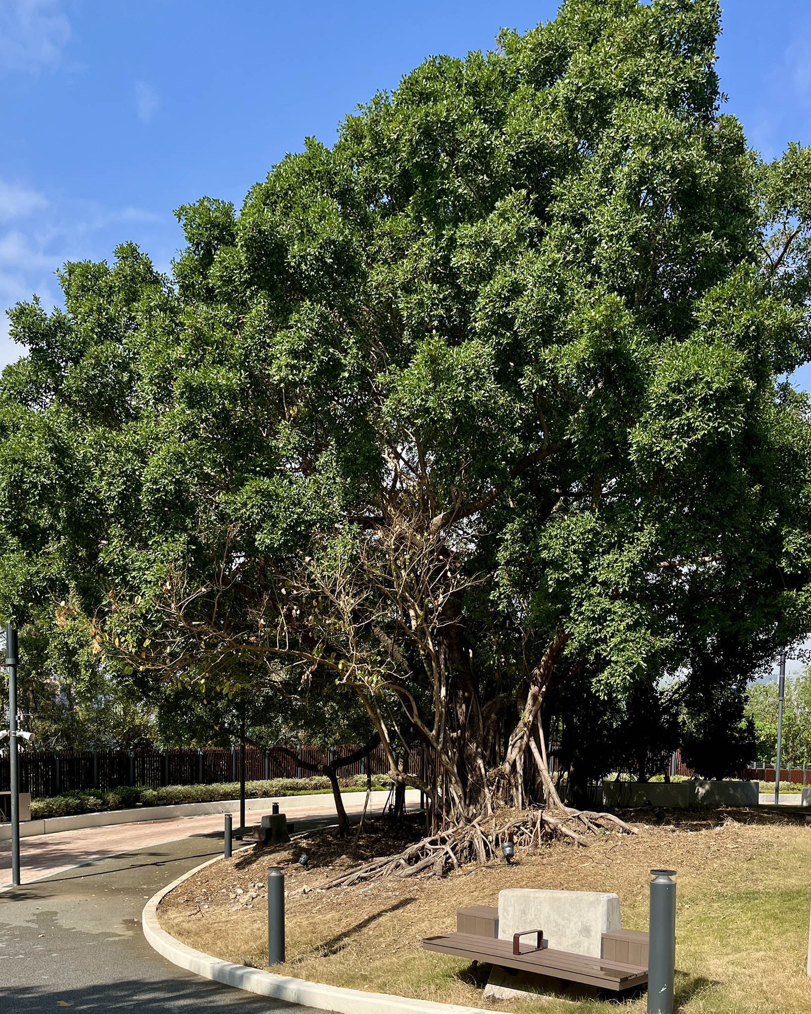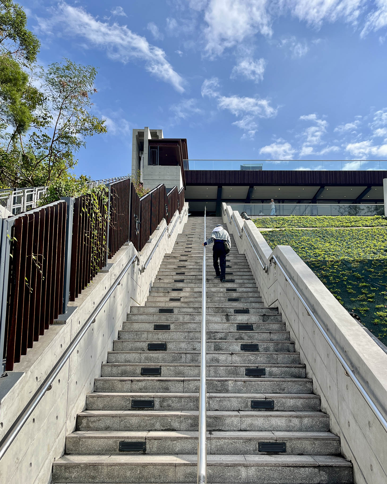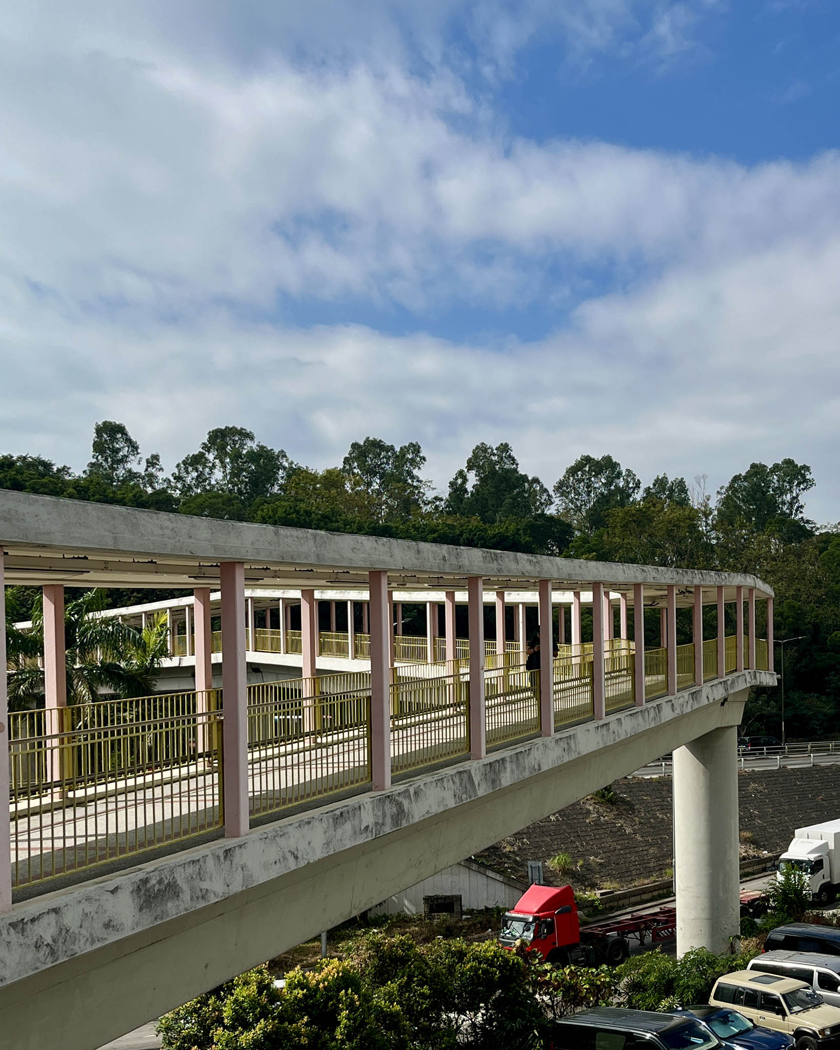 不過周遭的噪音問題卻稍稍破壞了這份寫意——鞦韆長椅和觀景台面向葵裕街的方向,正下方是一個回收場,重型機械運作的聲音不斷,而且因為鄰近工業區,大貨車經過的頻率甚高,不時傳來轟隆聲響。而在六個鞦韆長椅中,也只有最右方的兩個鞦韆享有無遮擋的景觀,其餘的都被樹木擋住前方風景。