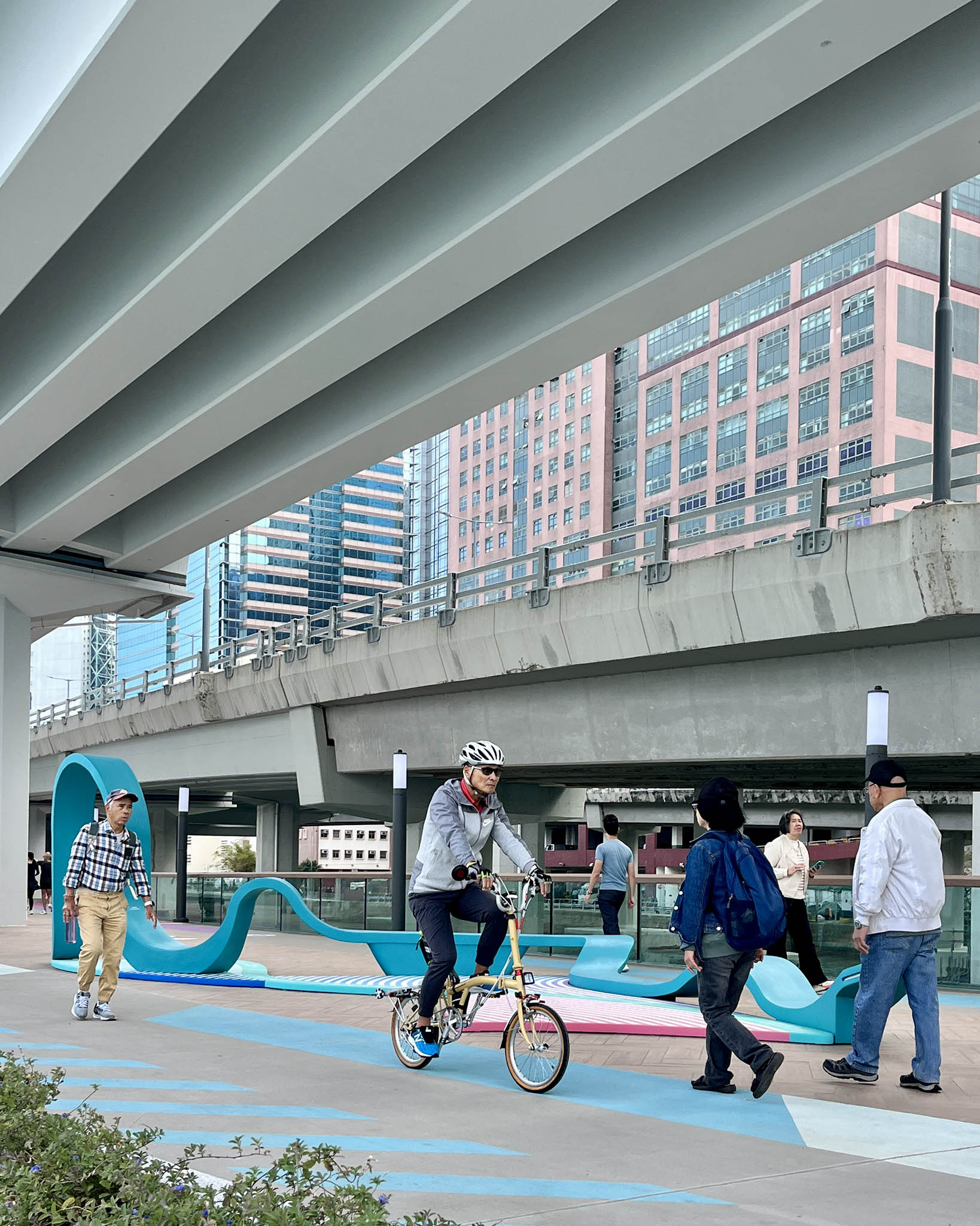 板道的高低錯落有致,各個段落都有不同氣氛和風景,距離橋底較近的位置因為日光較少,營造出較隱密的空間感,露天的部分則十分開揚,可以遙望對岸高挑的建築群和九龍山脊線。在西段設有轉盤橋,東段則有開合橋,兩者是在維港首次引入的橋樑設計,對香港而言較為新鮮,不過一般都會保持連接狀態,以確保板道暢通。