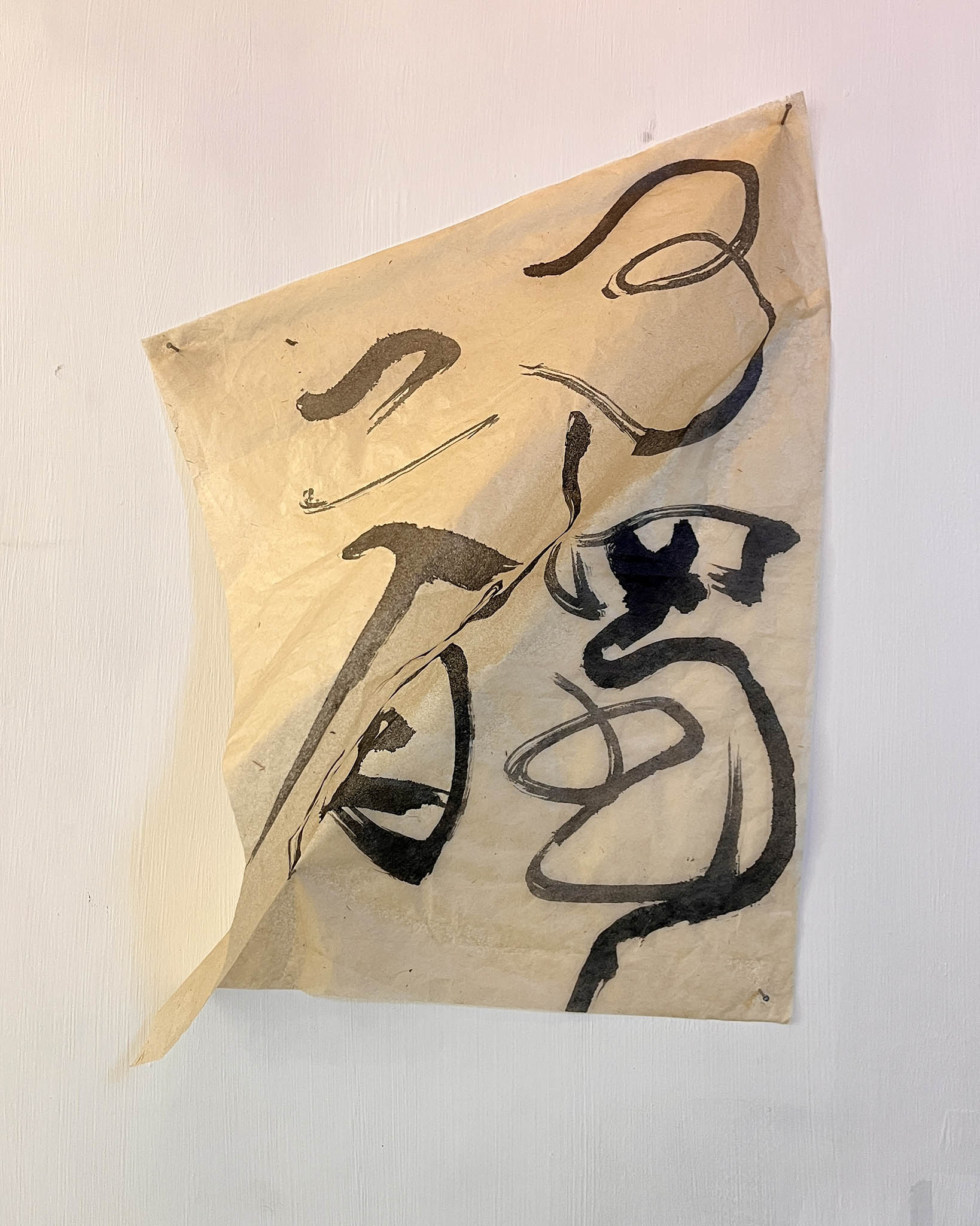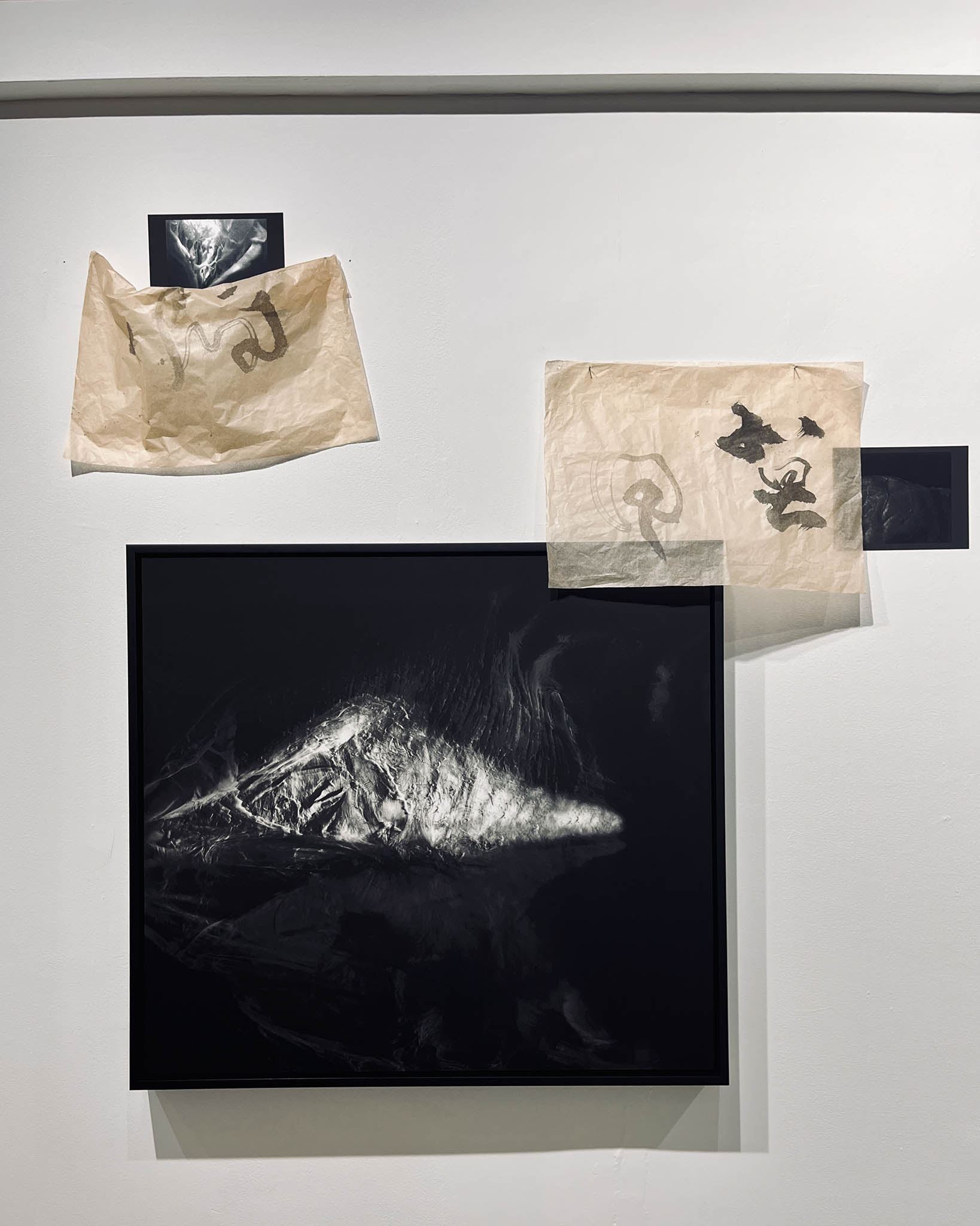 八年後今日,作品不但以展覽方式重現——肺像樹、盆骨似山峰、⼤網膜如輕紗。陳的又聯同中式書法家朝花 @lightime_blossoming ,挑選了當中10幅作品,將創作融合中式書法和AI技術,陳的以名為「Skin」的紙張印製攝影作品,朝花則運用肌膚色的蟬衣宣紙書寫單字,以書法回應各個人體部份,並以「二人三觸」為構思,策劃互動式觀展體驗,並邀請大眾參觀,與藝術家和身體進行一場對話。
