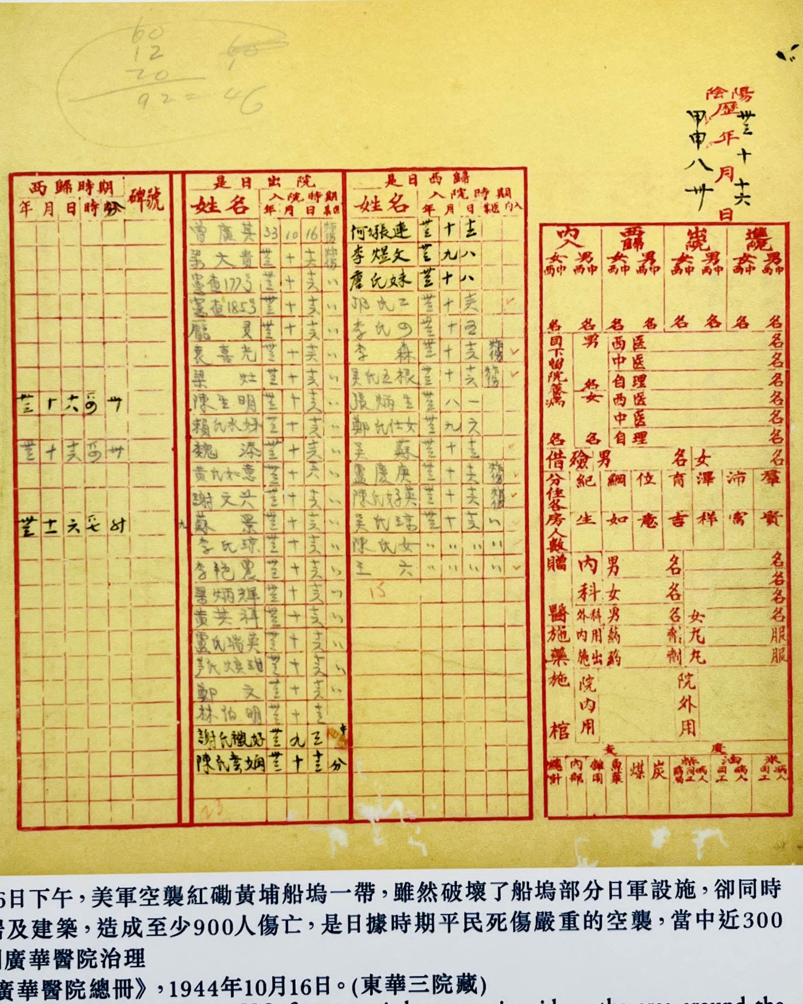 雖有航拍圖片標示轟炸目標,但不少目標附近也有民居,空襲炸彈也並非每次都投射精準,以致大量市民受傷。但當時九龍醫院已被日軍侵佔為軍醫院,整個九龍就只剩廣華醫院屬較有規模的醫院。面對戰爭,醫護人員堅持努力醫治傷者,期間得到前醫務衛生總監司徒永覺和佔領當局提供資金和物資。當年的廣華醫院大堂,現時則被改建為東華三院文物館,亦被列為法定古蹟。